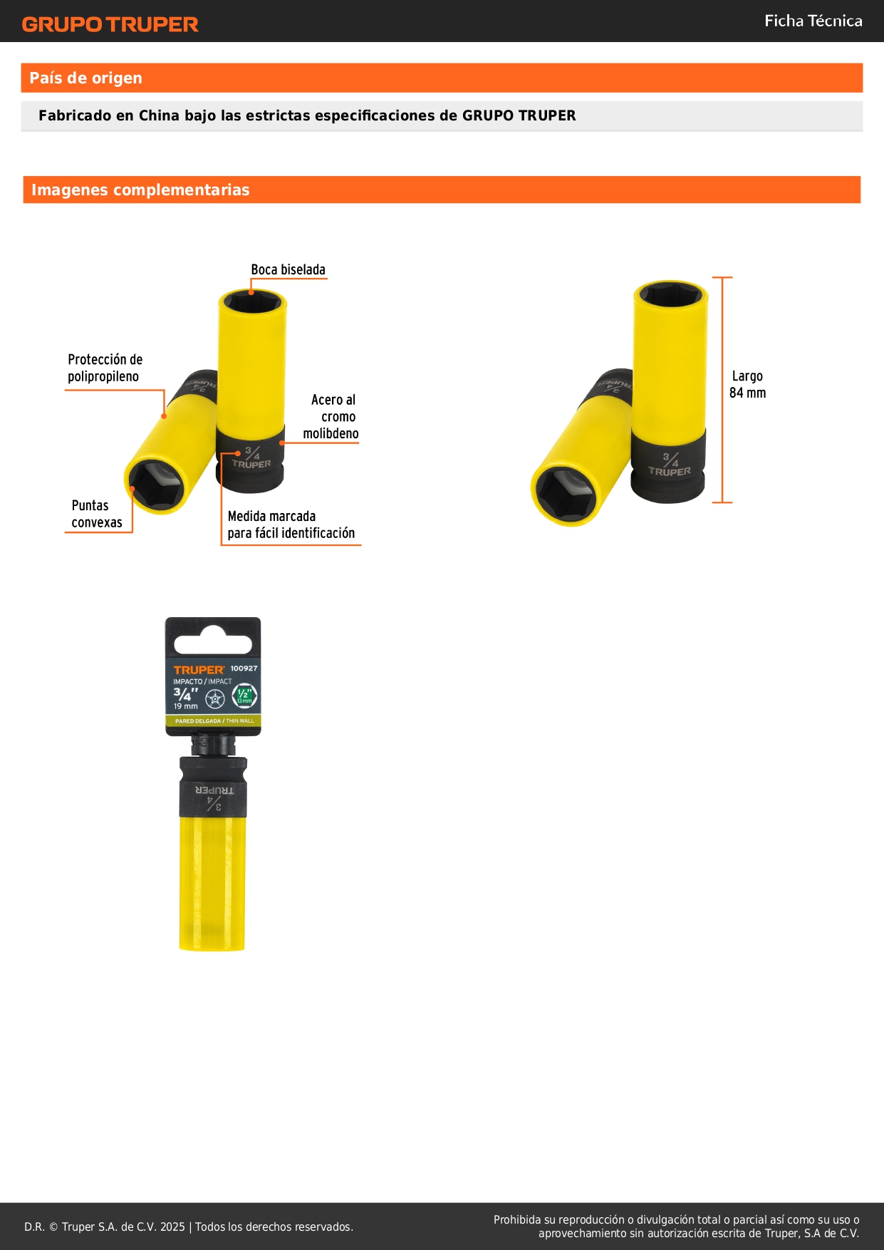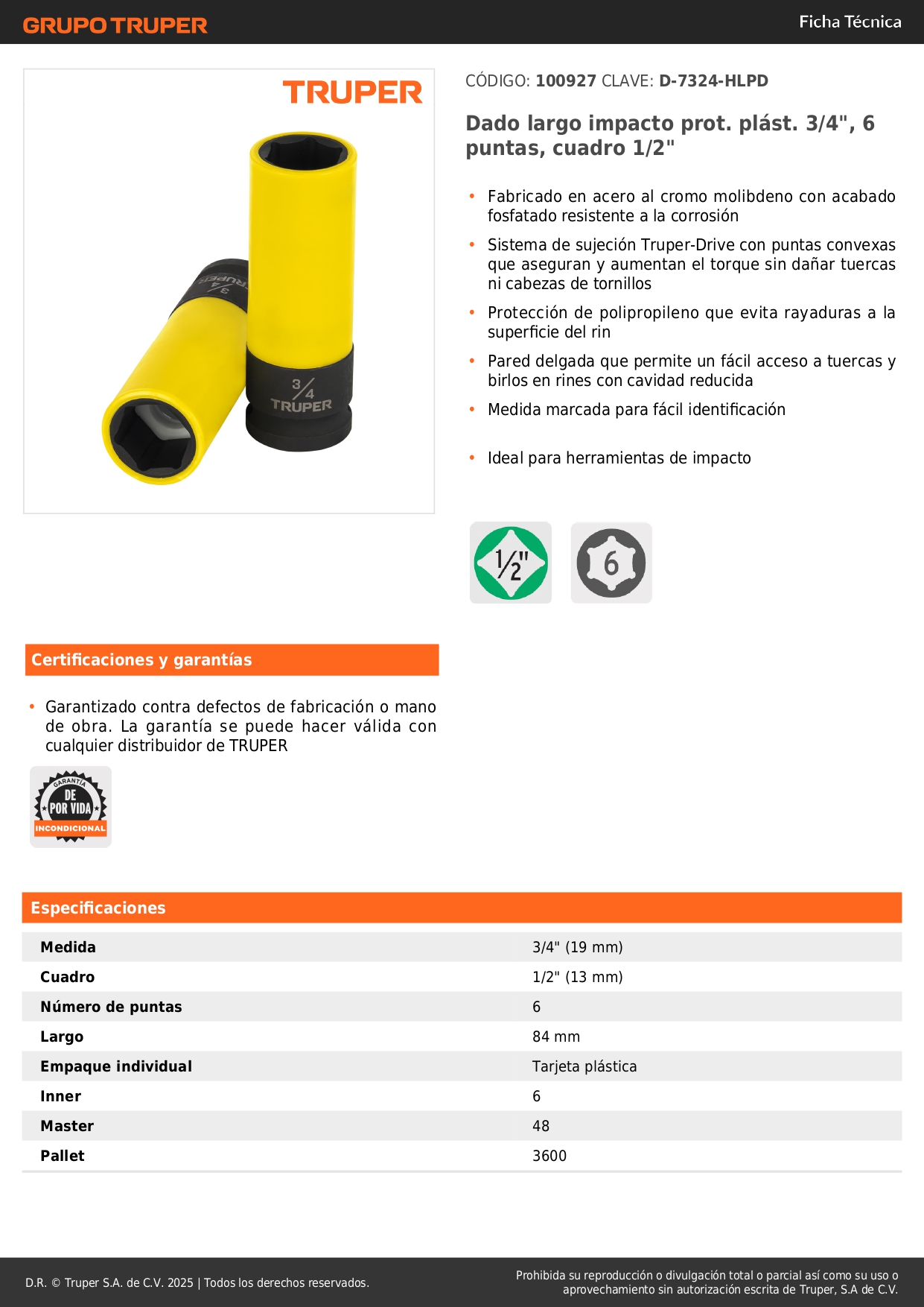 Dado largo impacto, 3/4´´, 6 p, protec plástica, cuadro 1/2´´ Truper
