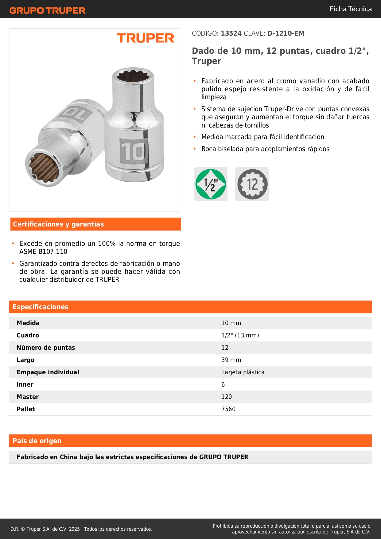 Dado poligonal encastre 1/2'' de 10 mm Truper