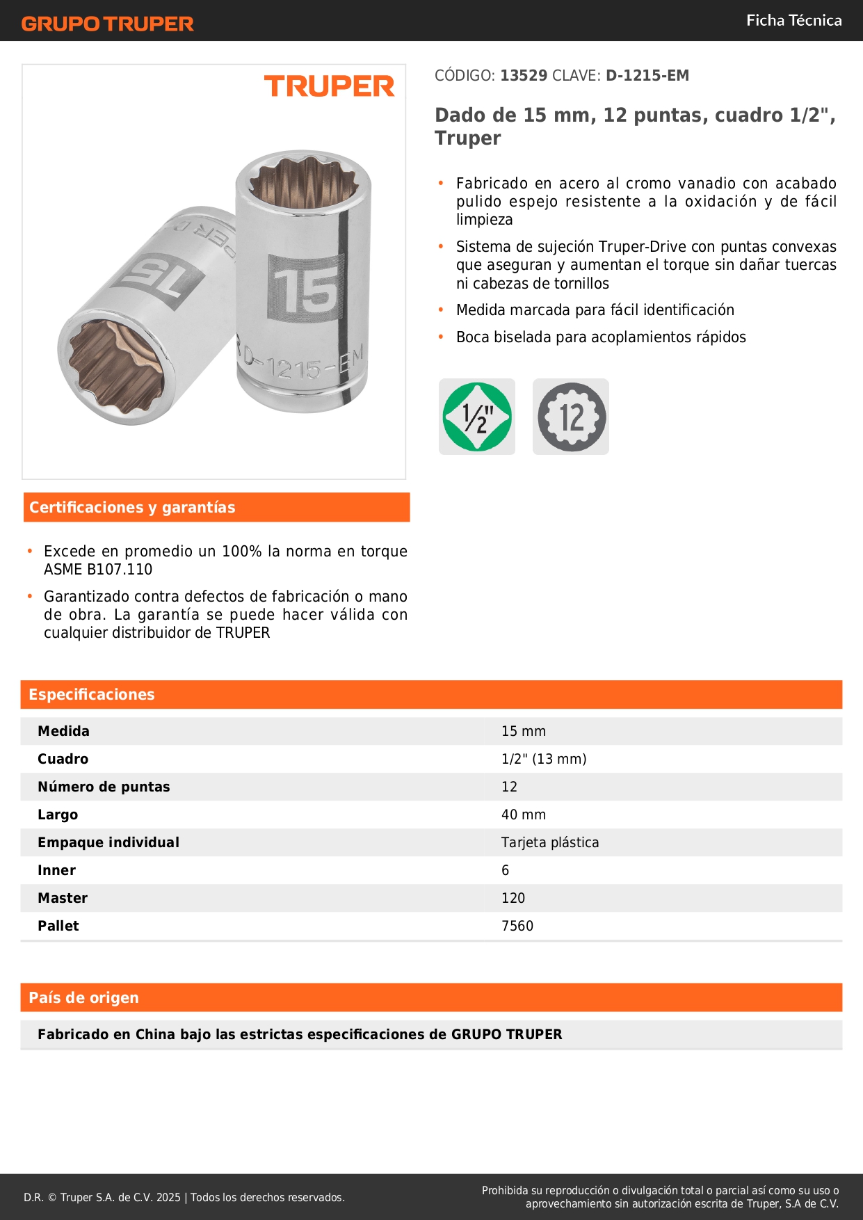 Dado poligonal encastre 1/2'' de 15 mm Truper