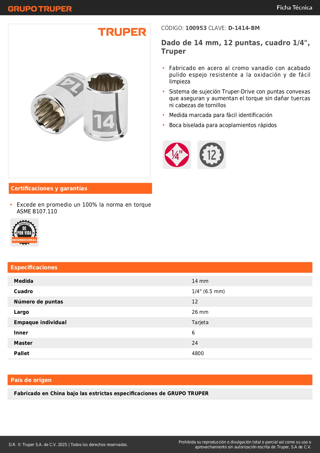 Dado poligonal encastre 1/4'' de 14 mm Truper