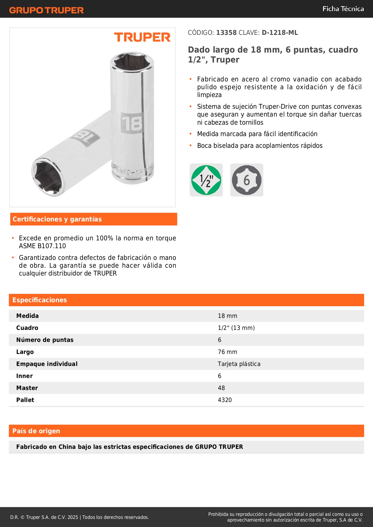 Dado tubular hexagonal encastre 1/2'' de 18 mm Truper