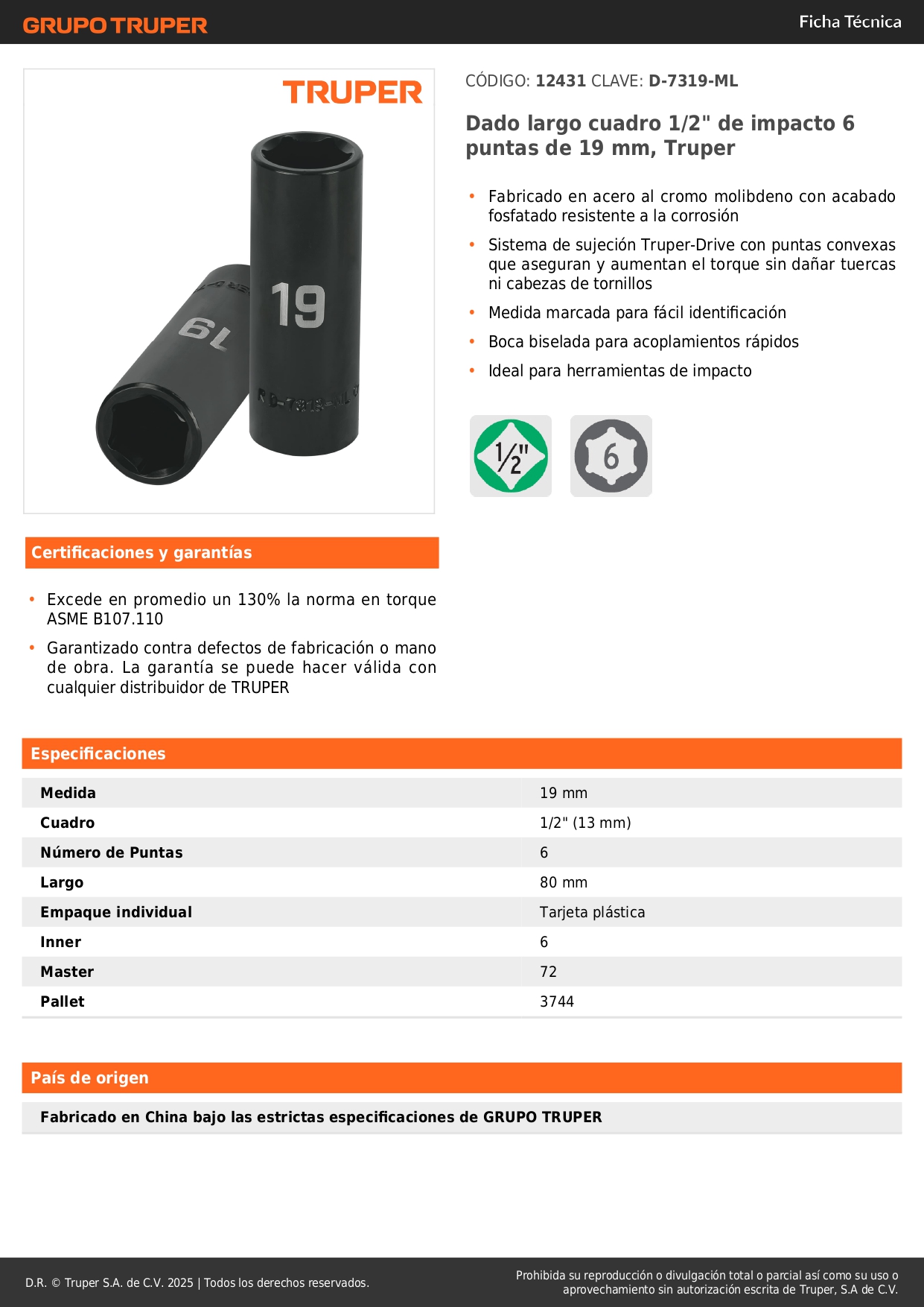 Dado tubular hexagonal encastre 1/2'' de impacto de 19 mm Truper