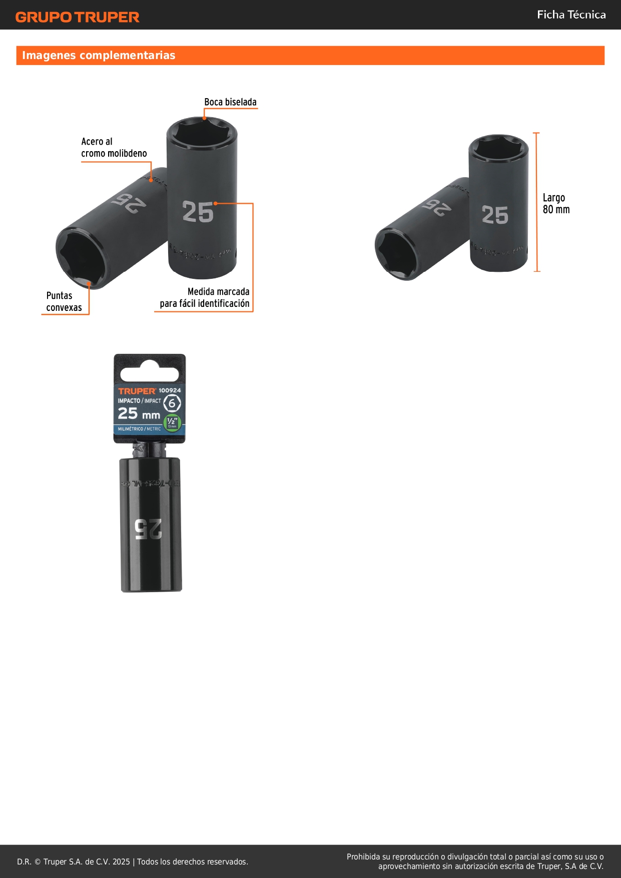 Dado tubular hexagonal encastre 1/2´´ de impacto de 25 mm, Truper