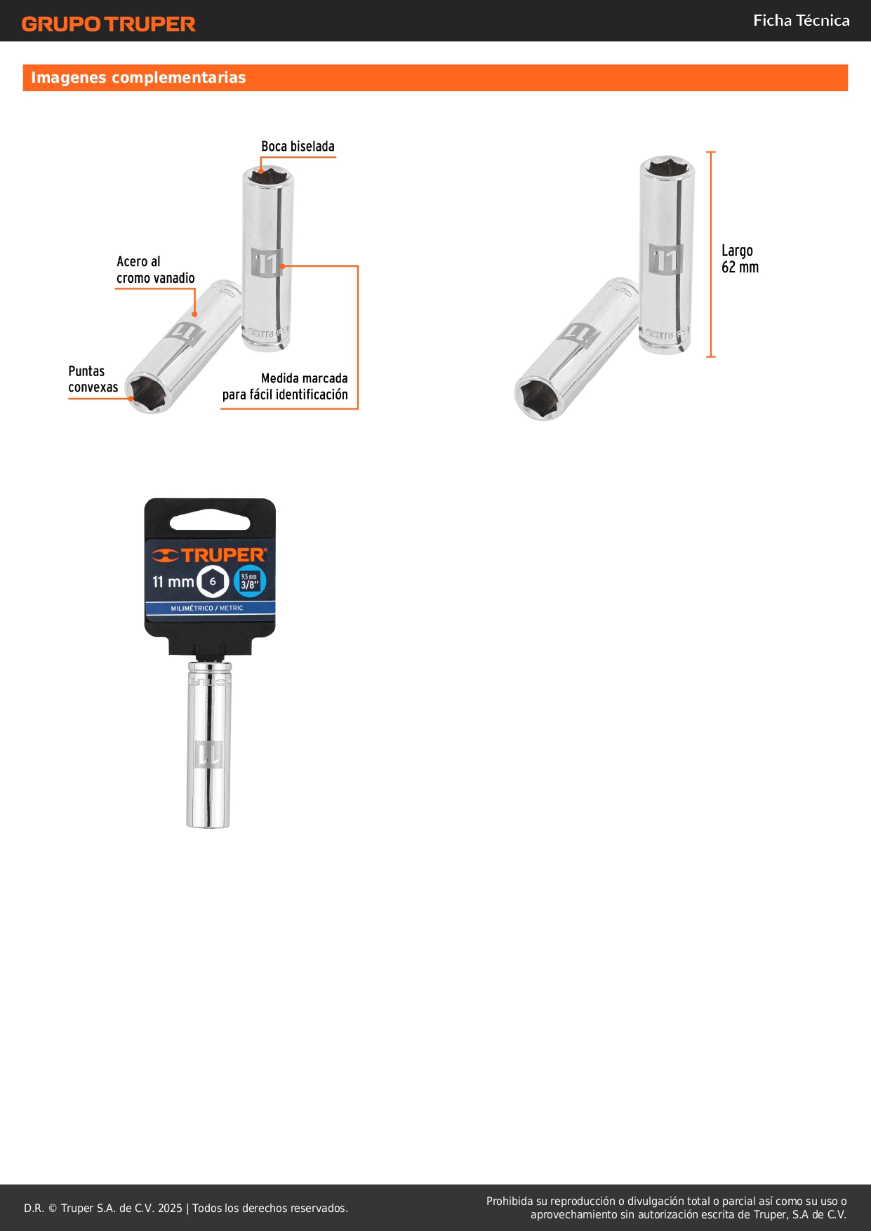 Dado tubular hexagonal encastre 3/8´´ de 11 mm, Truper