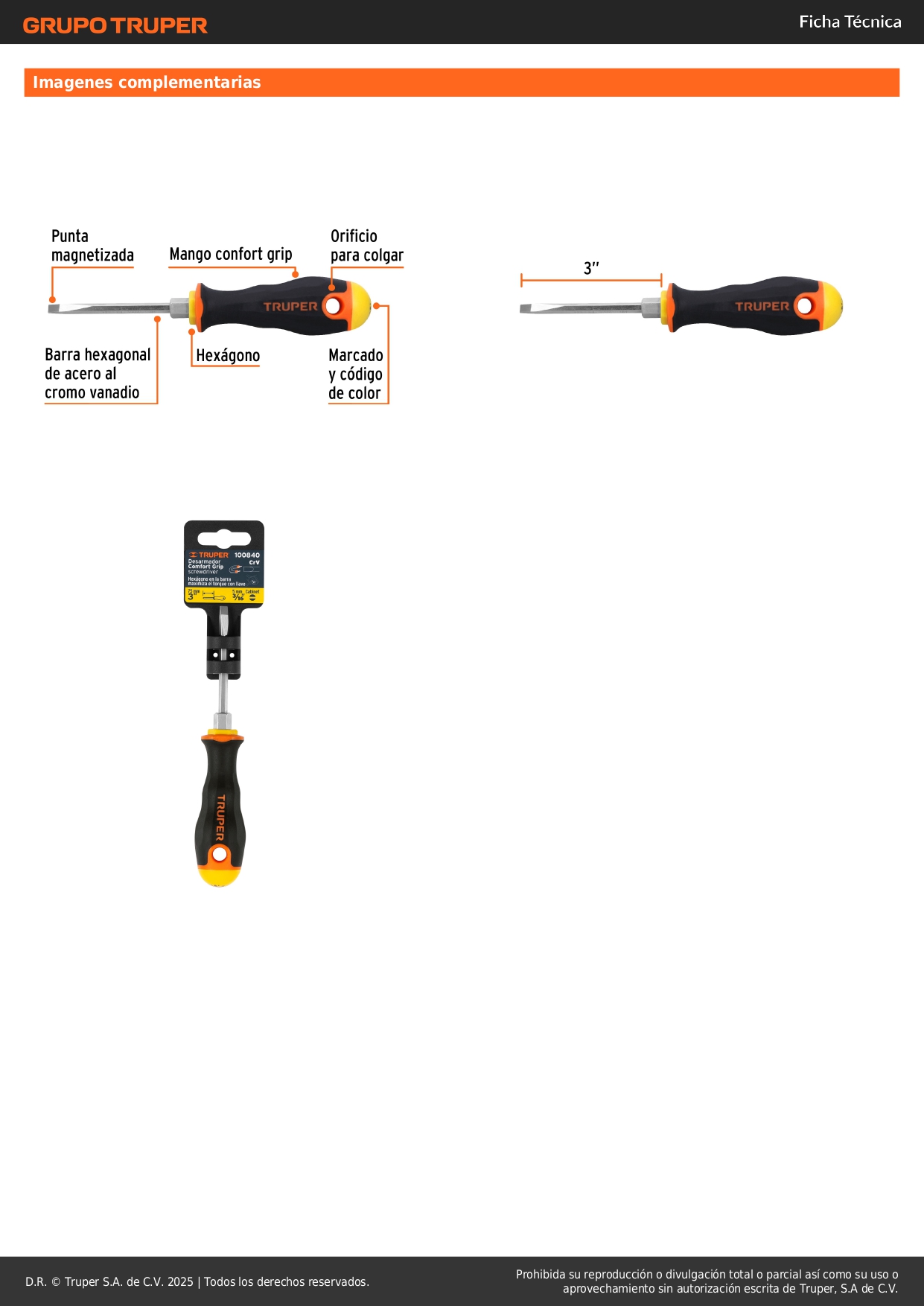 Desarmador cabinet 3/16 x 3´´ mango Comfort Grip, Truper