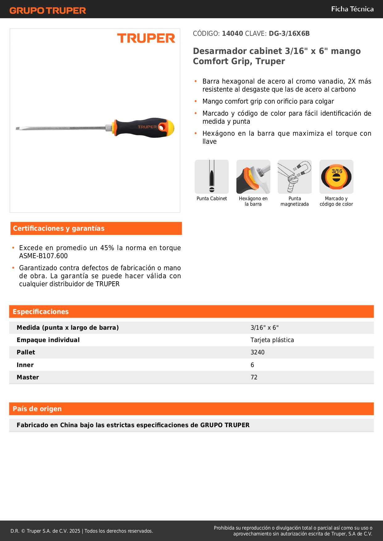 Desarmador cabinet 3/16´´ x 6´´ mango Comfort Grip, Truper