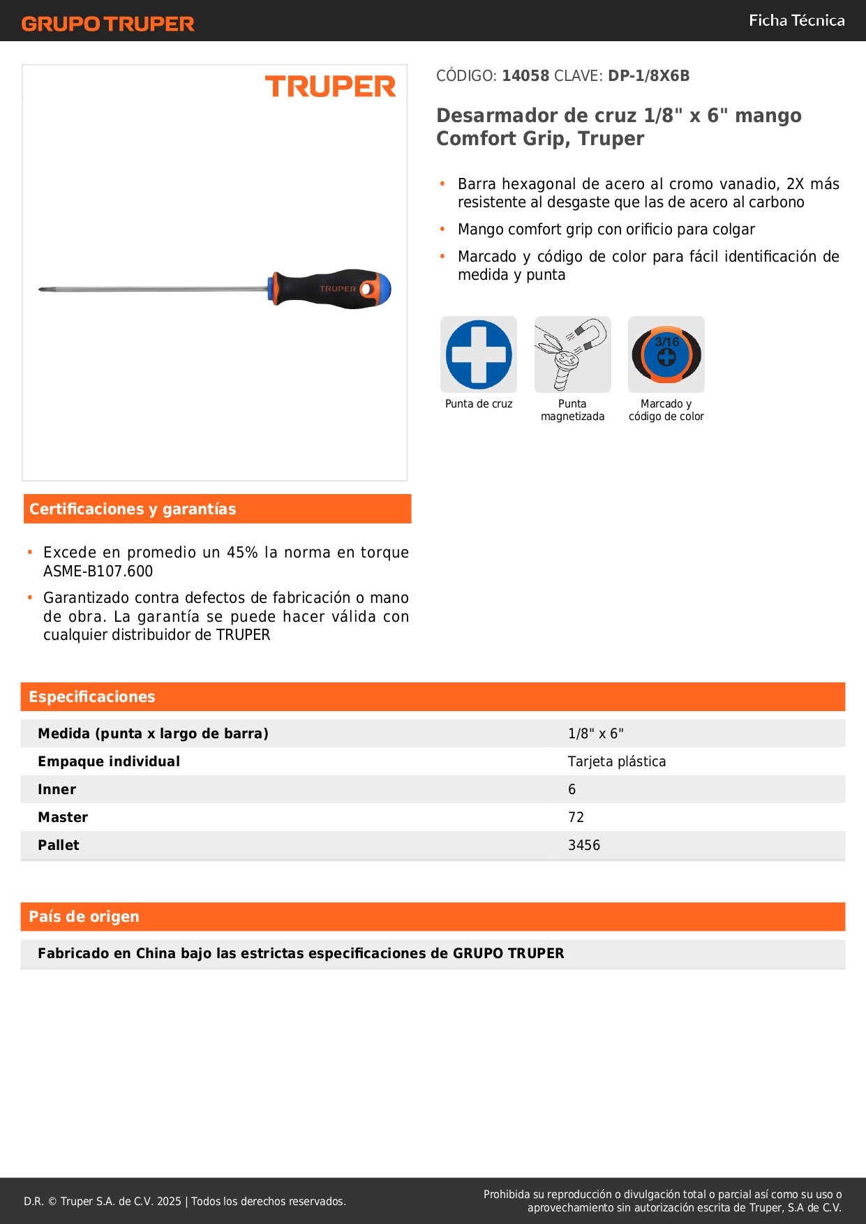 Desarmador de cruz 1/8'' x 6'' mango comfort grip. truper