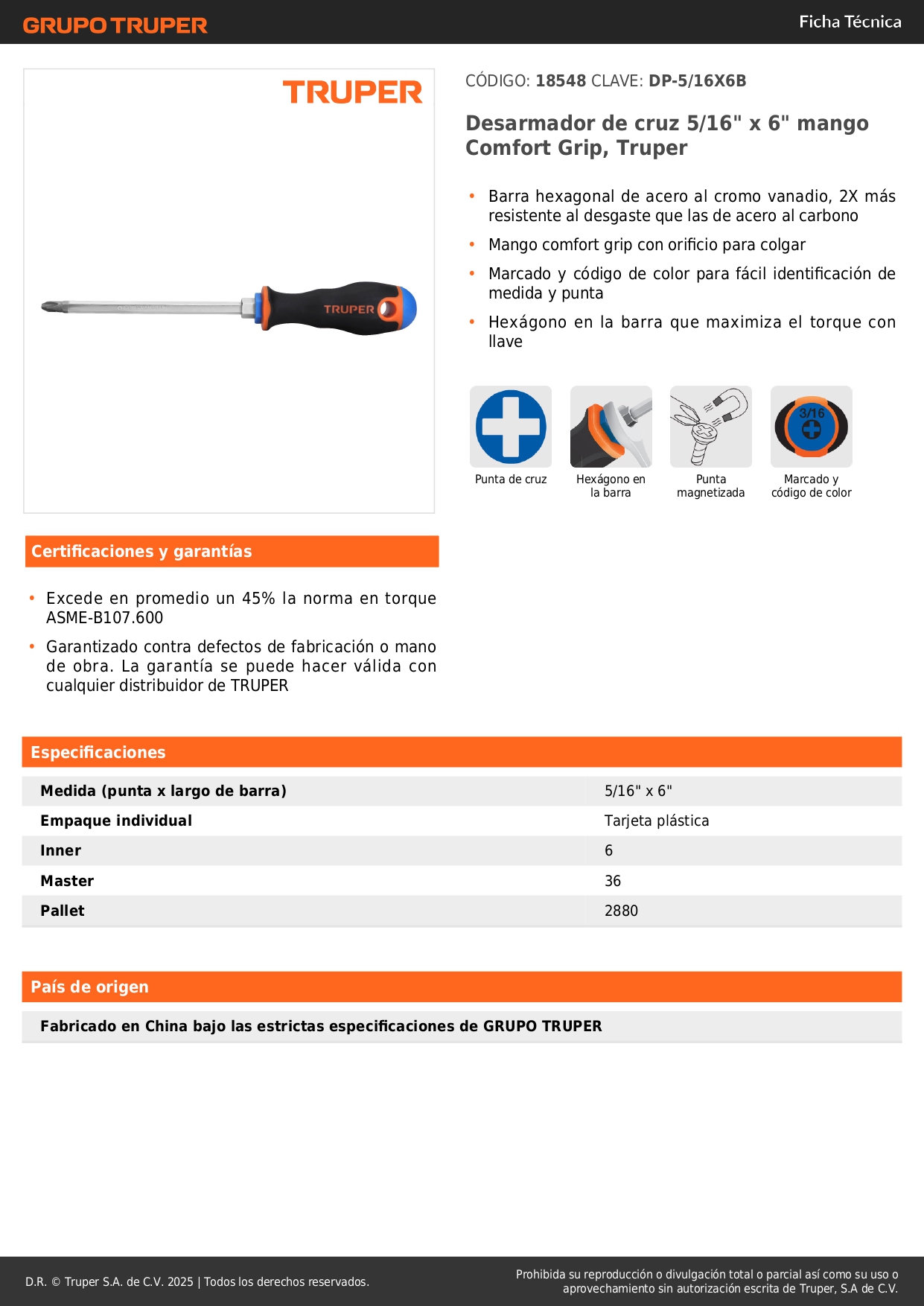 Desarmador de cruz 5/16´´ x 6´´ mango Comfort Grip, Truper