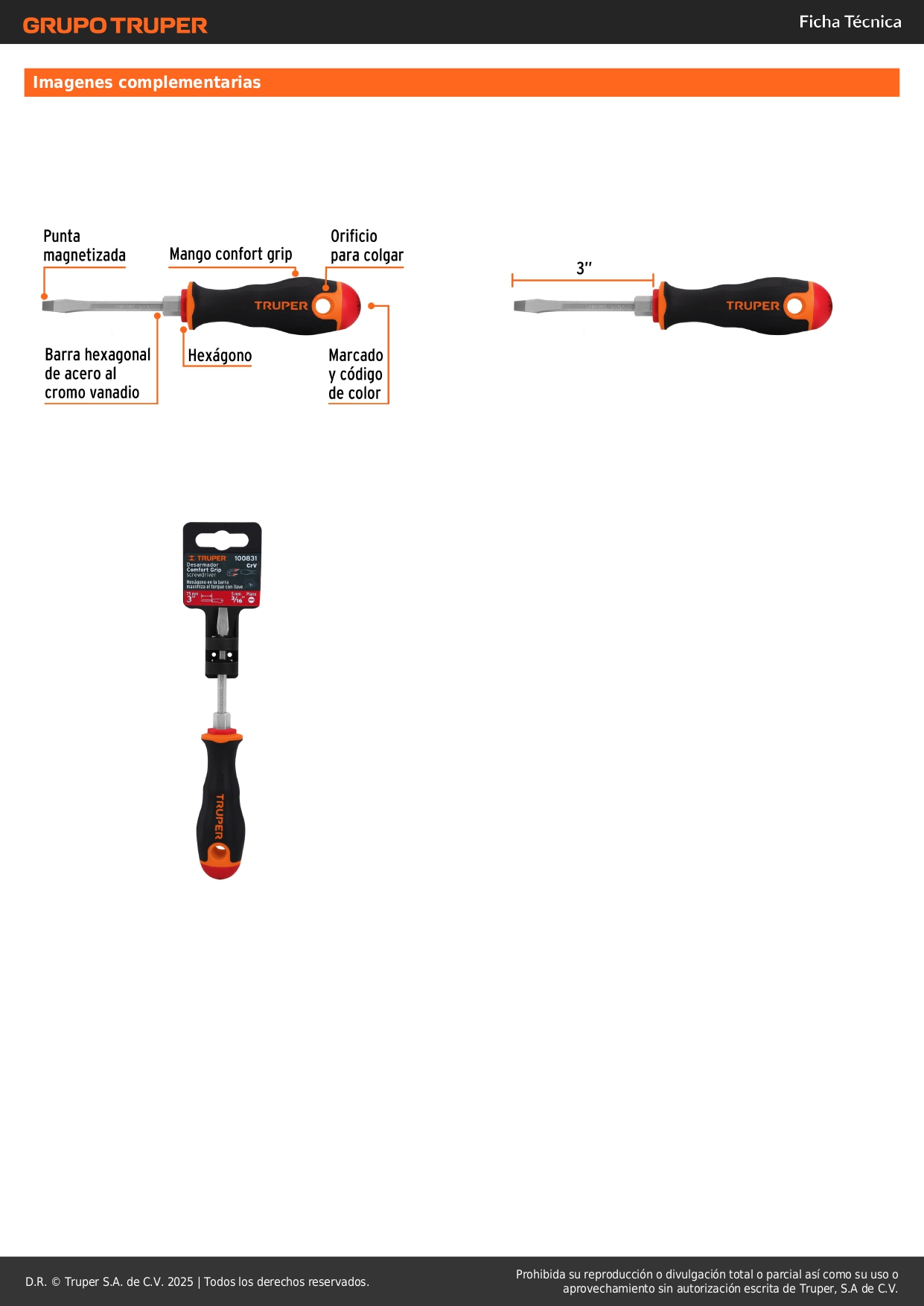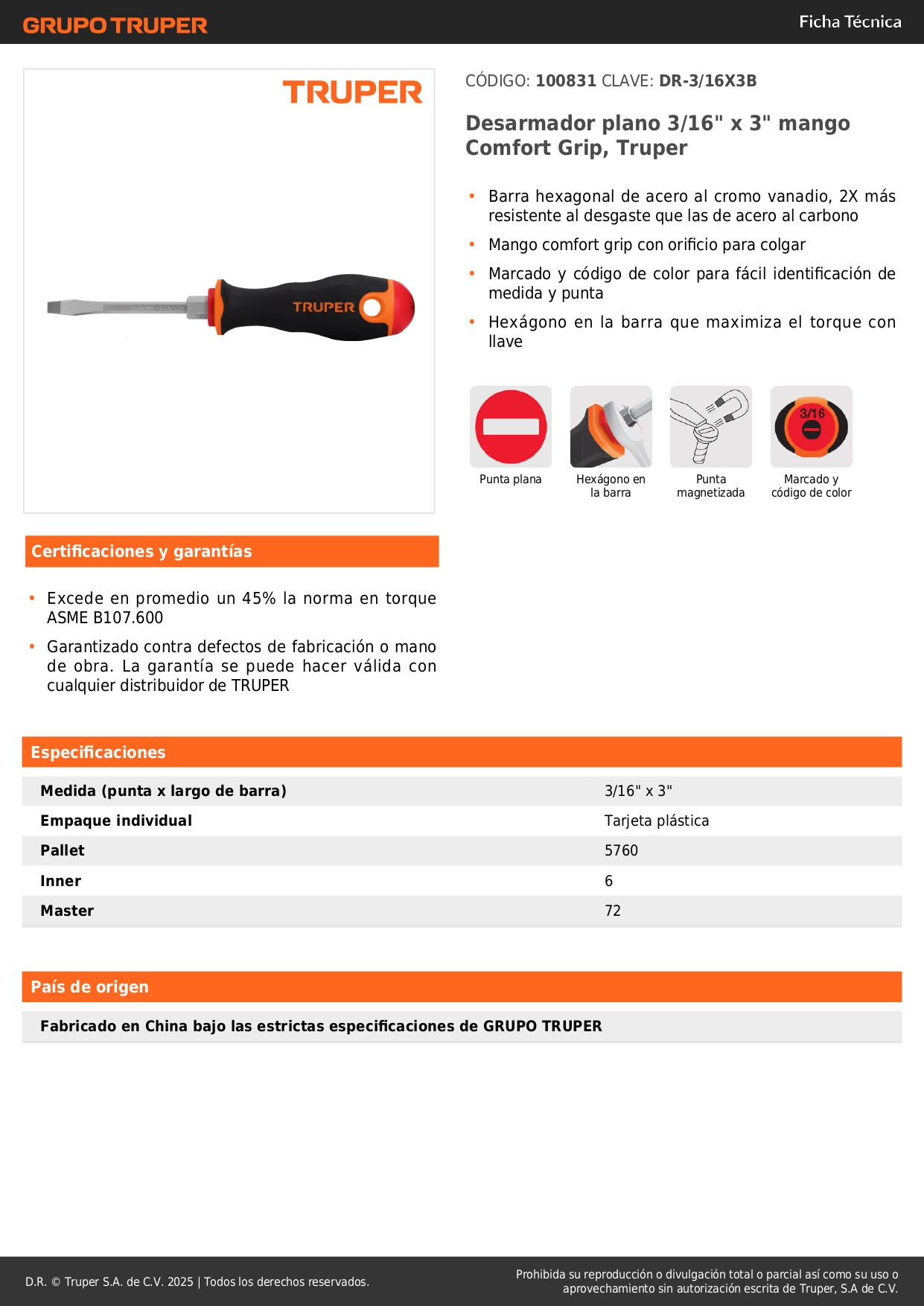 Desarmador plano 3/16´´ x 3´´ mango Comfort Grip, Truper