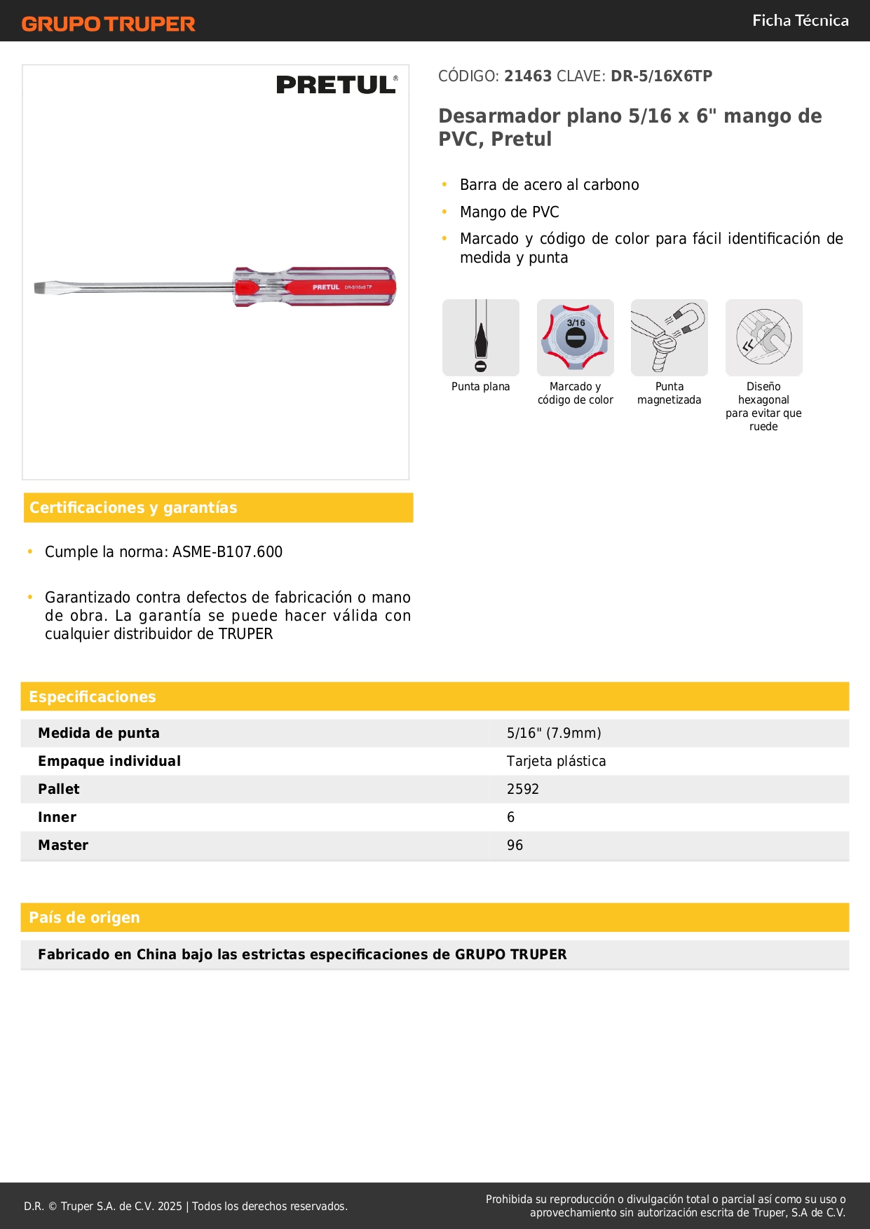 Desarmador plano 5/16 x 6'' mango de pvc. pretul