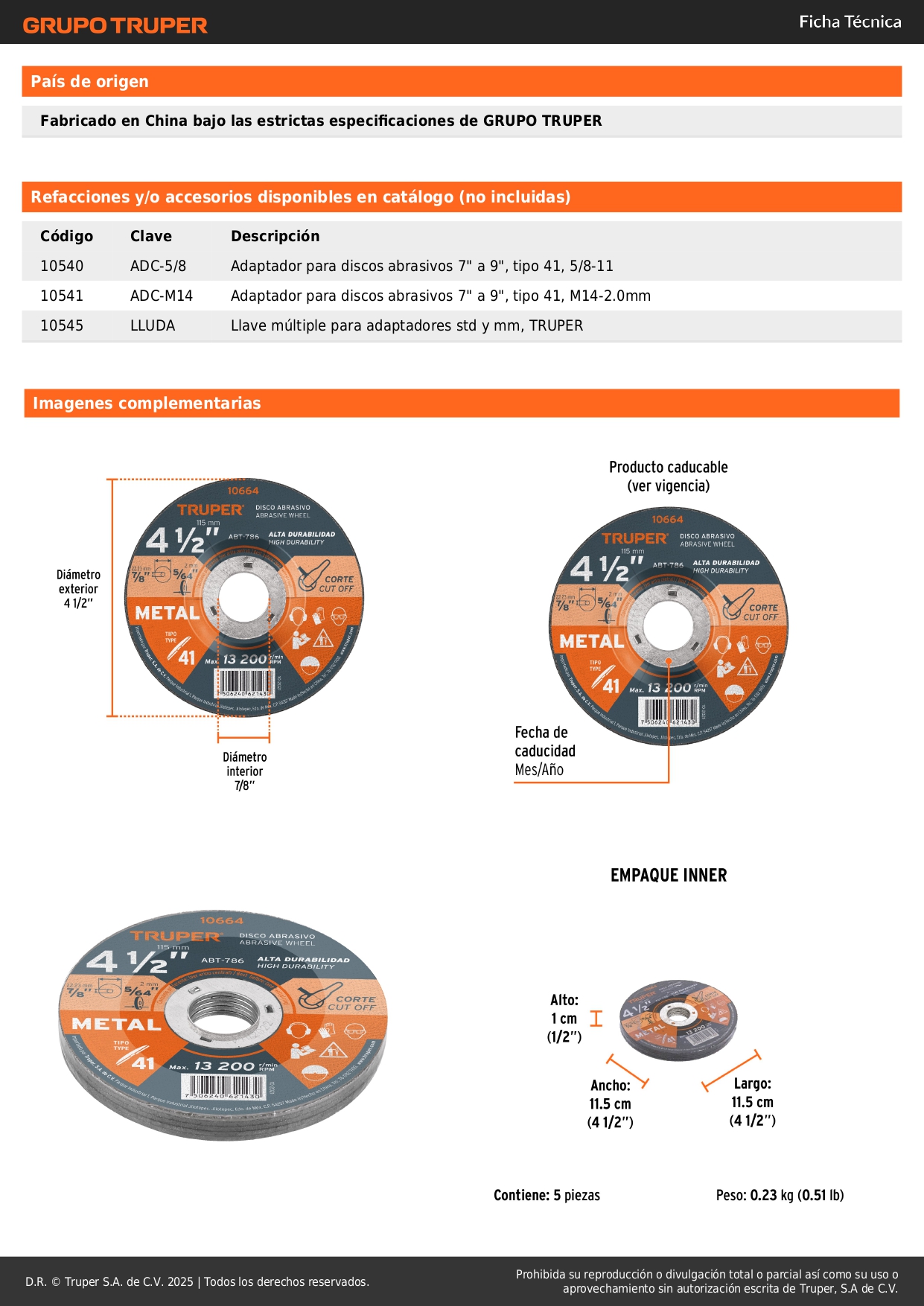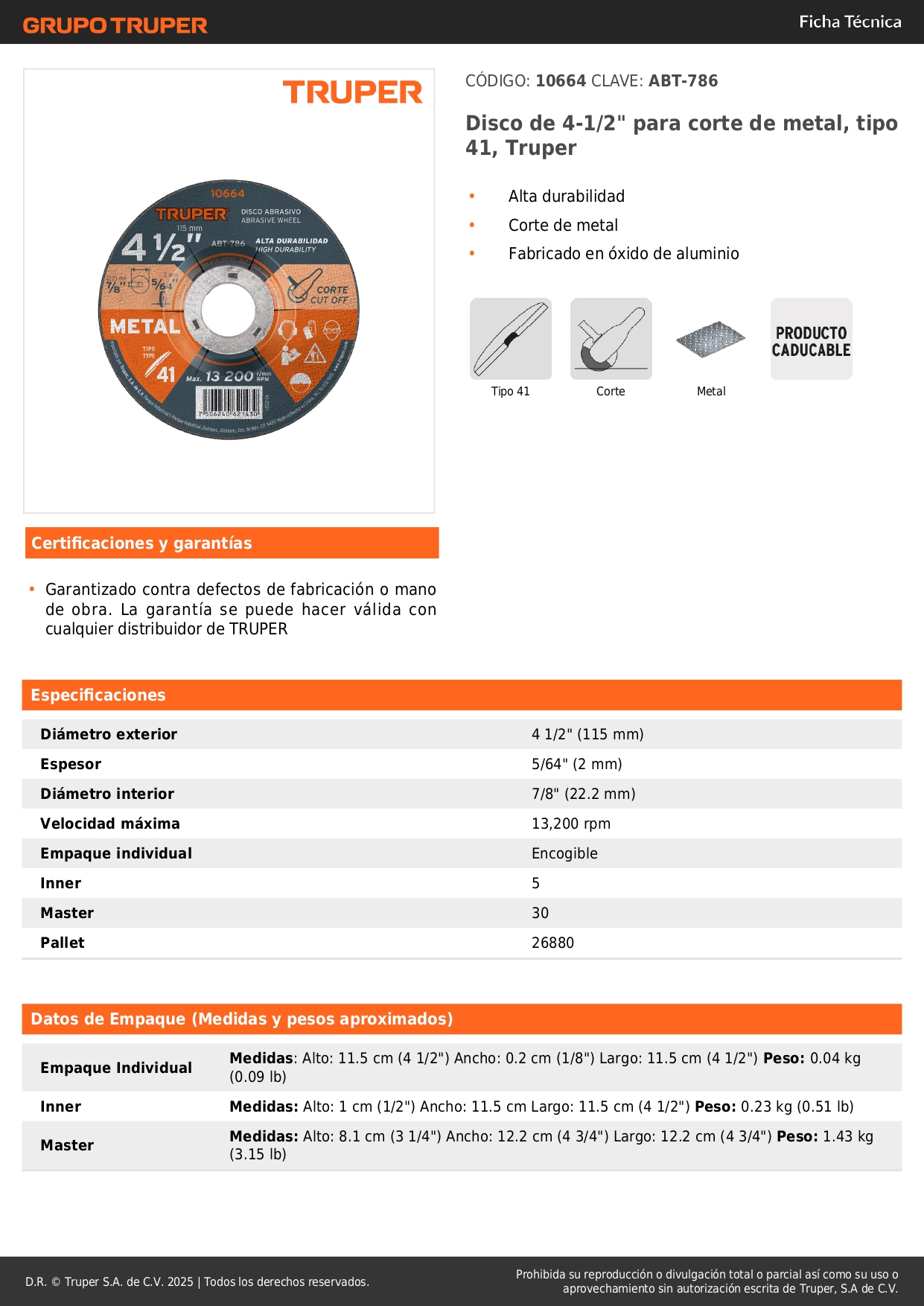 Disco de 4-1/2'' para corte de metal. tipo 41. Truper Stock por sucursal Stock por sucursal S/ 2.80 cantidad Agregar al carro Avísame cuando llegue -Alta durabilidad-Corte de metal-Fabricado en óxido de aluminio