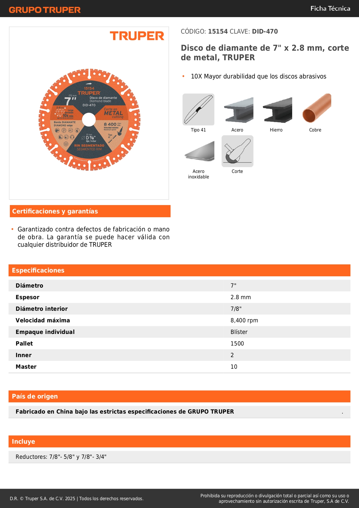 Disco de diamante, 7´´ corte metal Truper Stock por sucursal Stock por sucursal S/ 78.00 cantidad Agregar al carro Avísame cuando llegue -10X Mayor durabilidad que los discos abrasivos