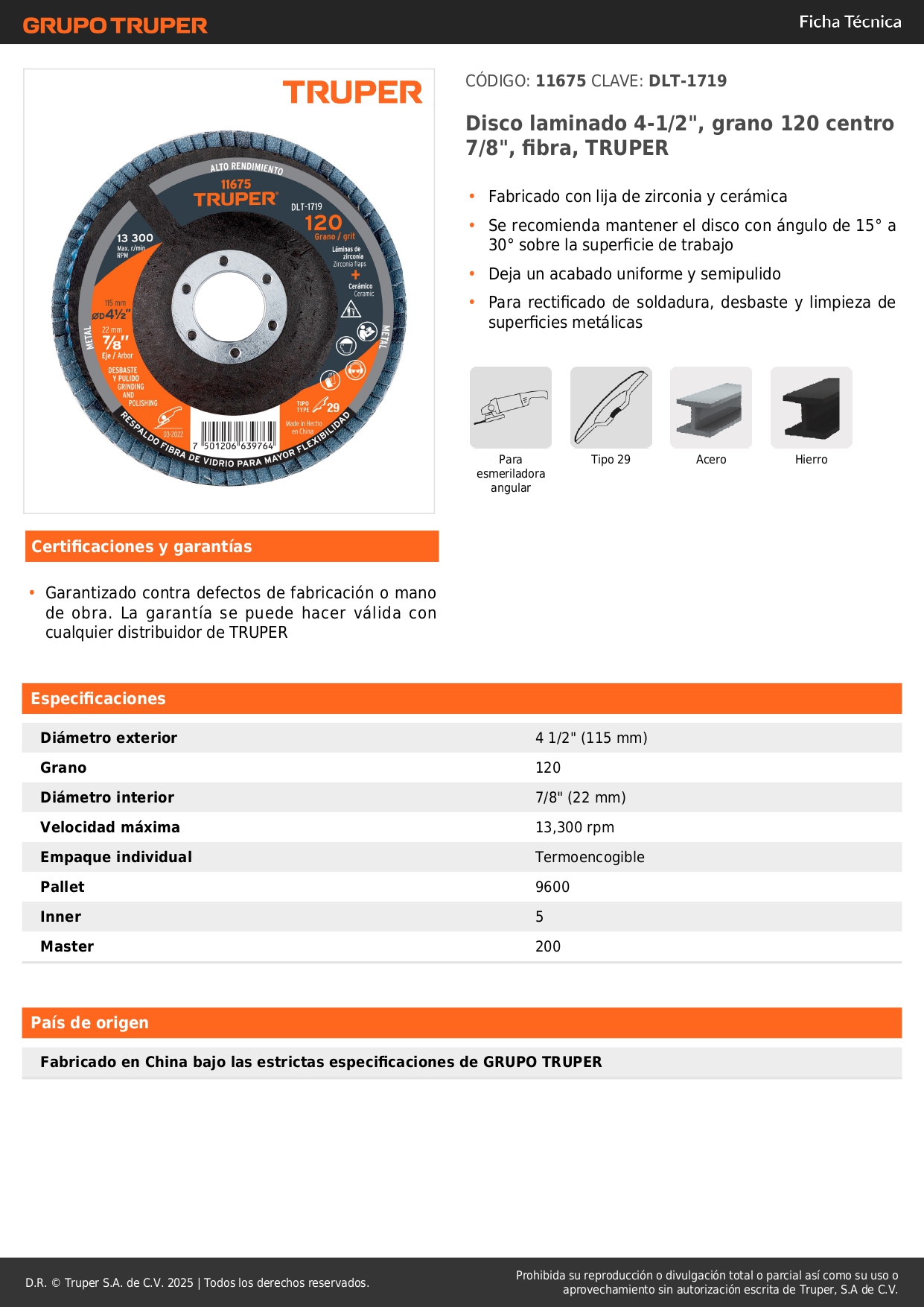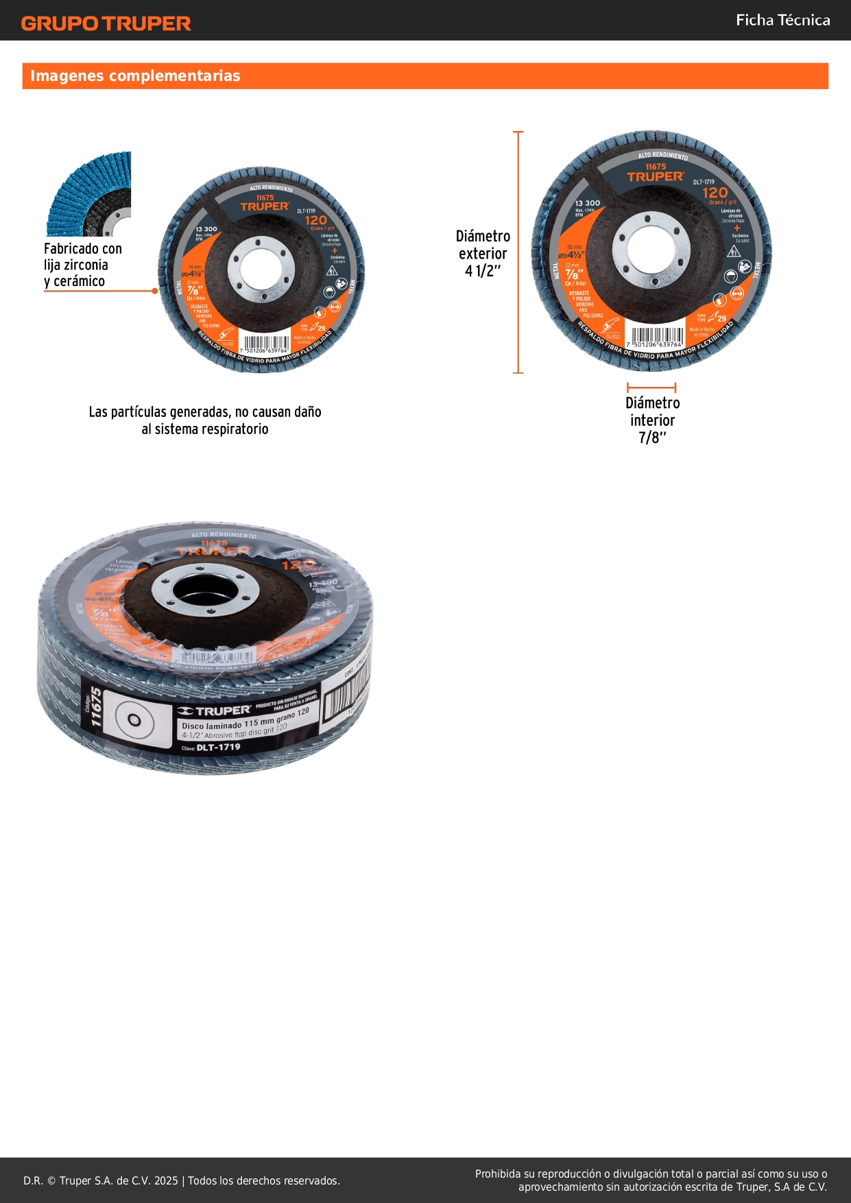 Disco flap 4-1/2´´ grano 120 centro 7/8´´, Truper