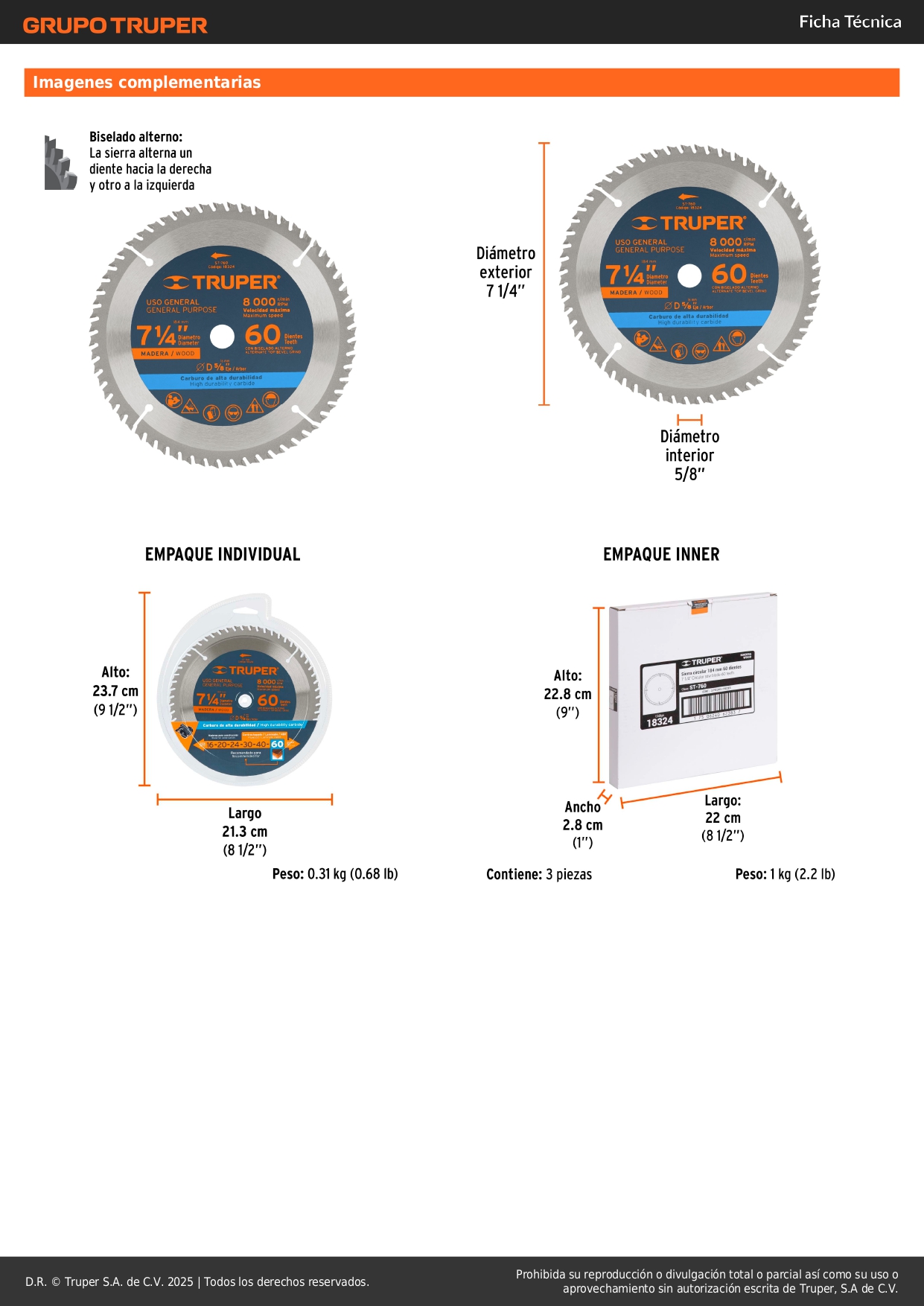 Disco sierra 7- 1/4" para madera, 60 dientes centro 5/8"