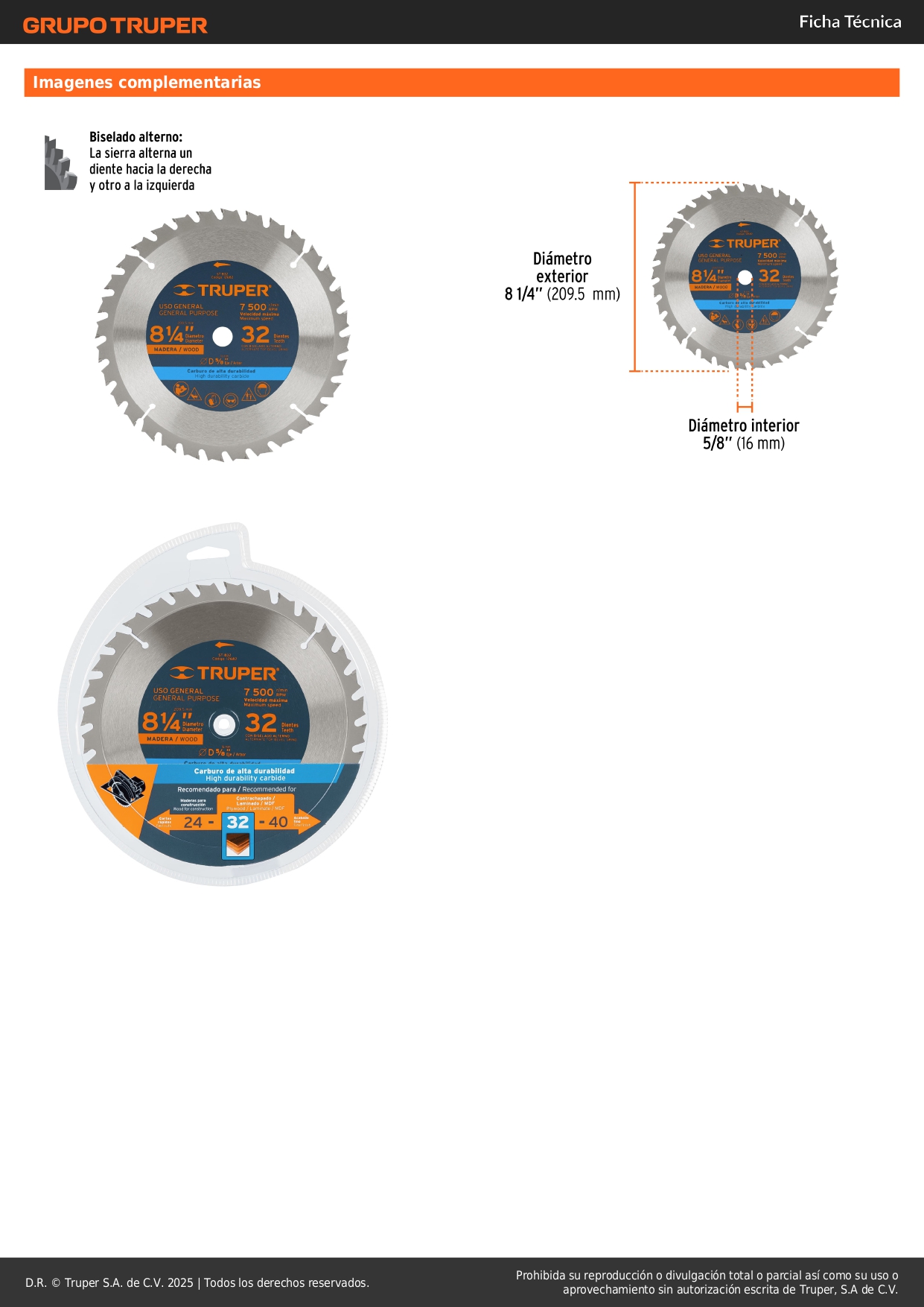 Disco sierra 8-1/4" para madera, 32 dientes centro 5/8"