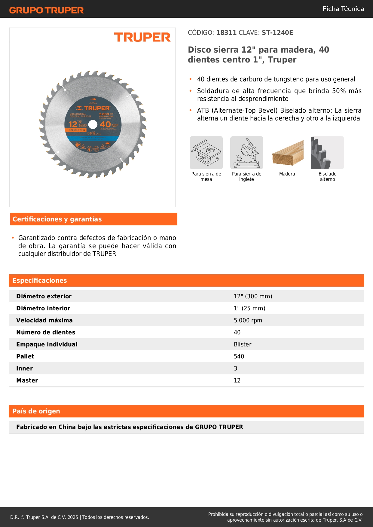 • 40 dientes de carburo de tungsteno para uso general