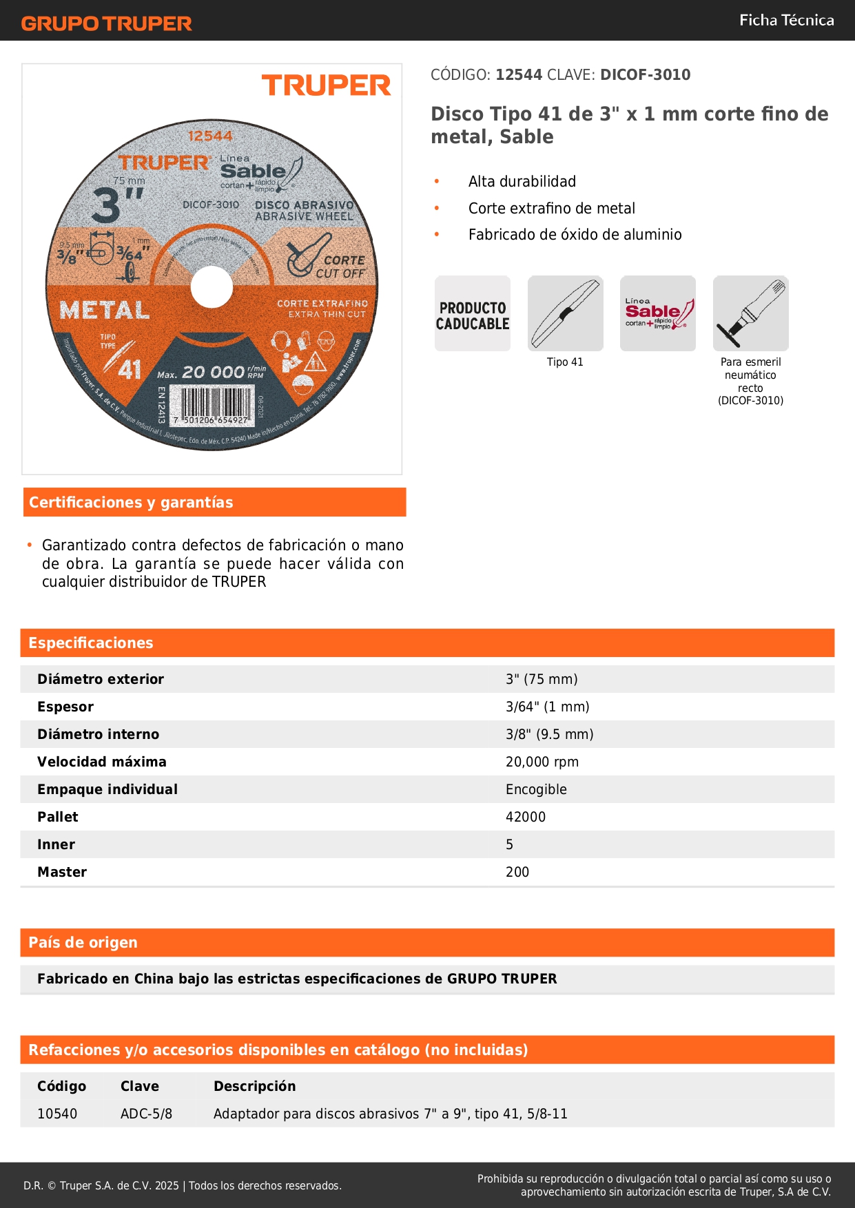 Disco Tipo 41 de 3´´ x 1 mm corte fino de metal, Sable Truper Stock por sucursal Stock por sucursal S/ 3.00 cantidad Agregar al carro Avísame cuando llegue -Alta durabilidad-Corte extrafino de metal-Fabricado de óxido de aluminio