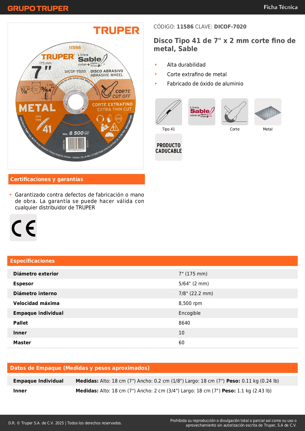 Disco Tipo 41 de 7´´ x 2 mm corte fino de metal, Sable Truper Stock por sucursal Stock por sucursal S/ 6.70 cantidad Agregar al carro Avísame cuando llegue -Alta durabilidad-Corte extrafino de metal-Fabricado de óxido de aluminio