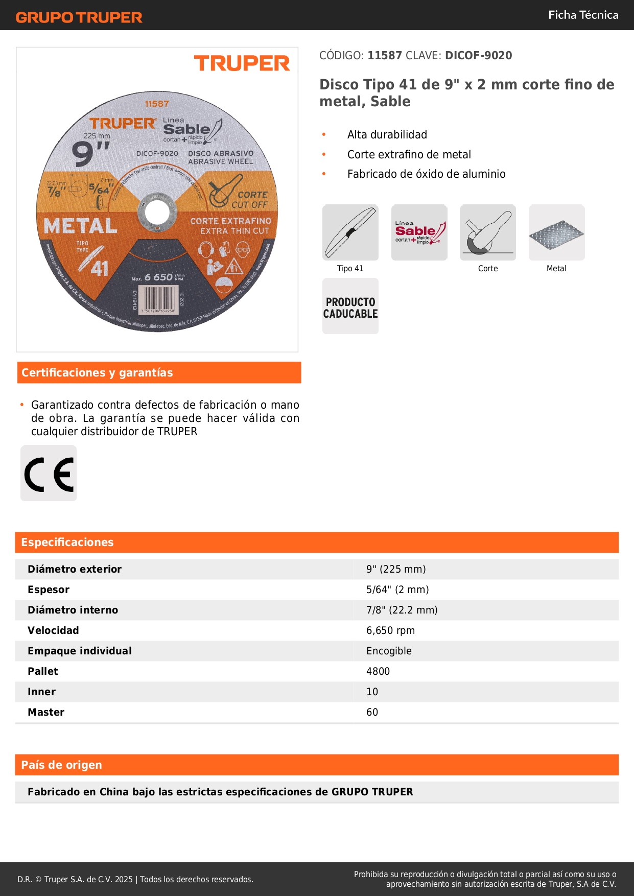 Disco Tipo 41 de 9´´ x 2 mm corte fino de metal, Sable Truper Stock por sucursal Stock por sucursal S/ 7.90 cantidad Agregar al carro Avísame cuando llegue -Alta durabilidad-Corte extrafino de metal-Fabricado de óxido de aluminio