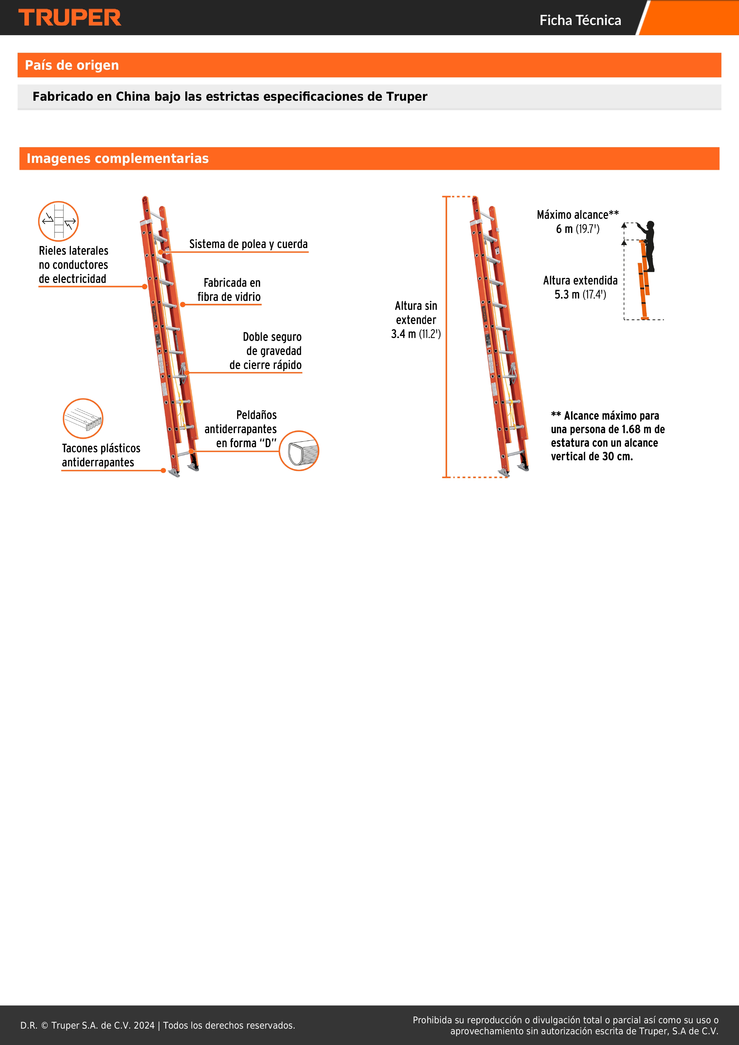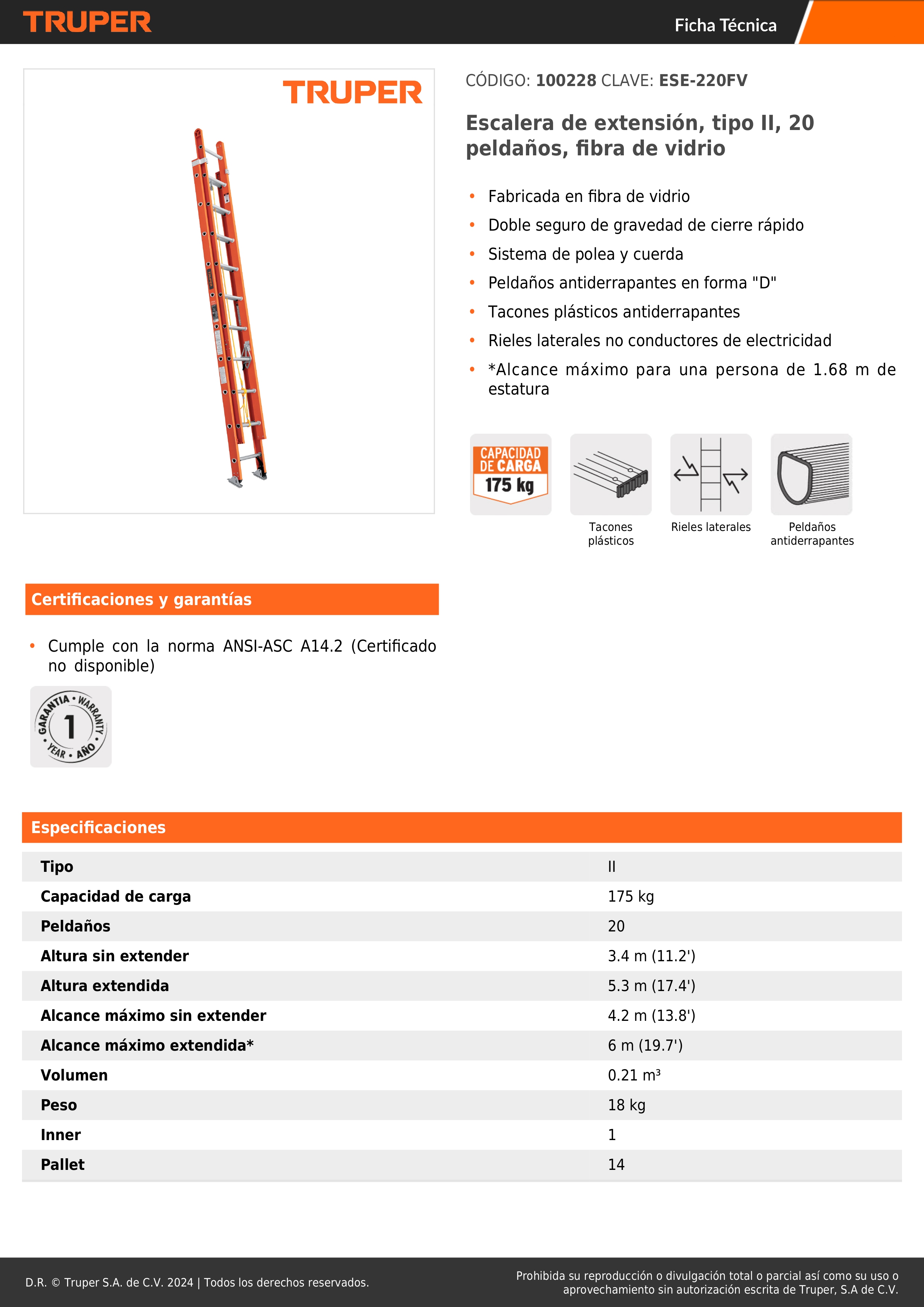Escalera de extensión, tipo II, 20 peldaños, fibra de vidrio
