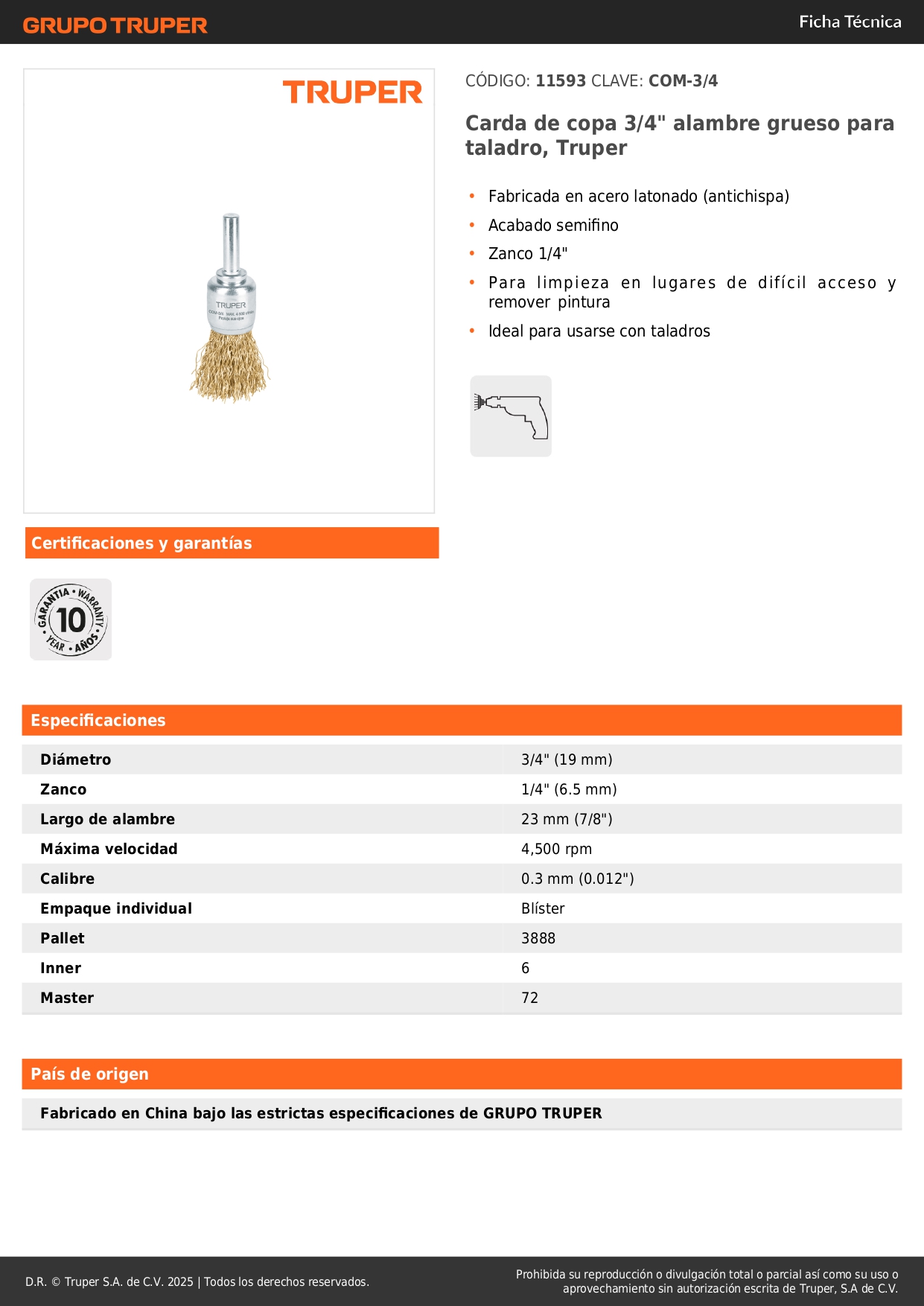 Escobilla tipo copa 3/4'' alambre grueso para taladro Truper