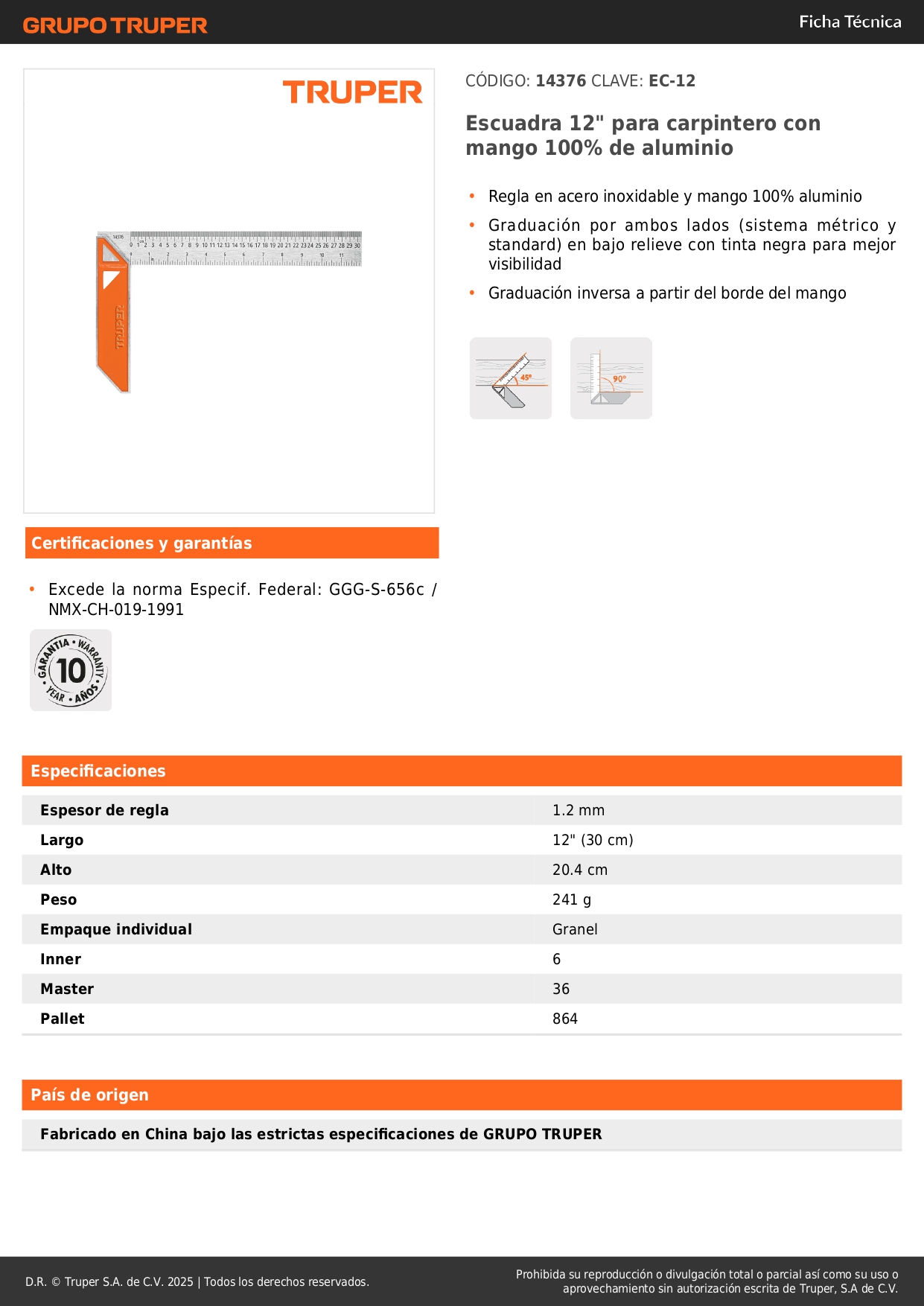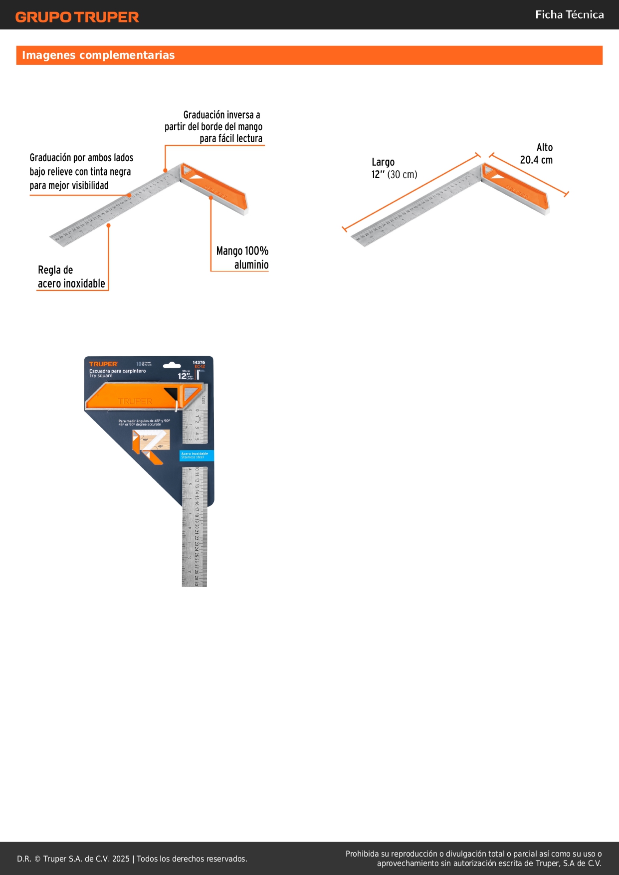 Escuadra 12" para carpintero con mango 100% de aluminio