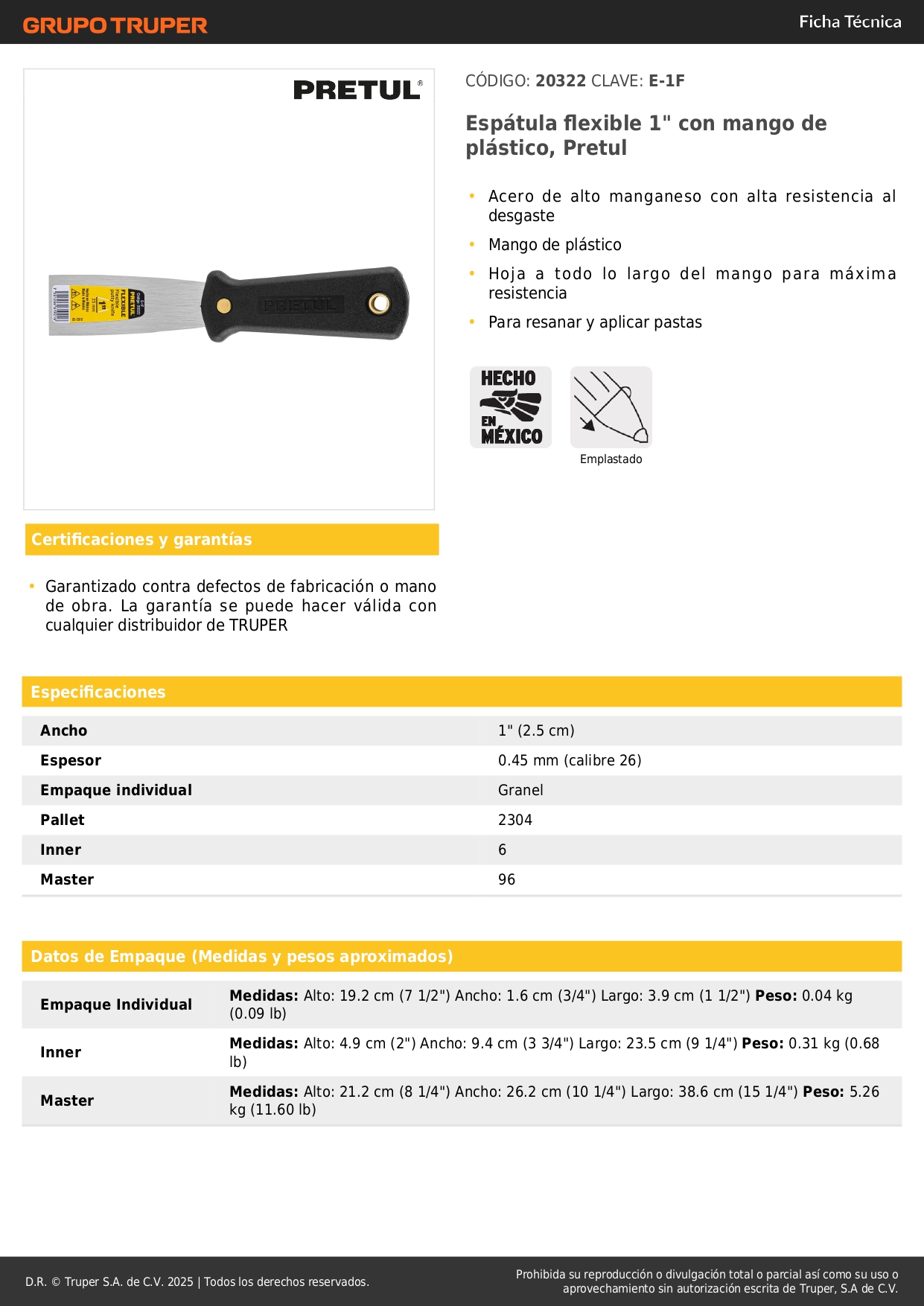 Espátula flexible 1´´ con mango de plástico, Pretul