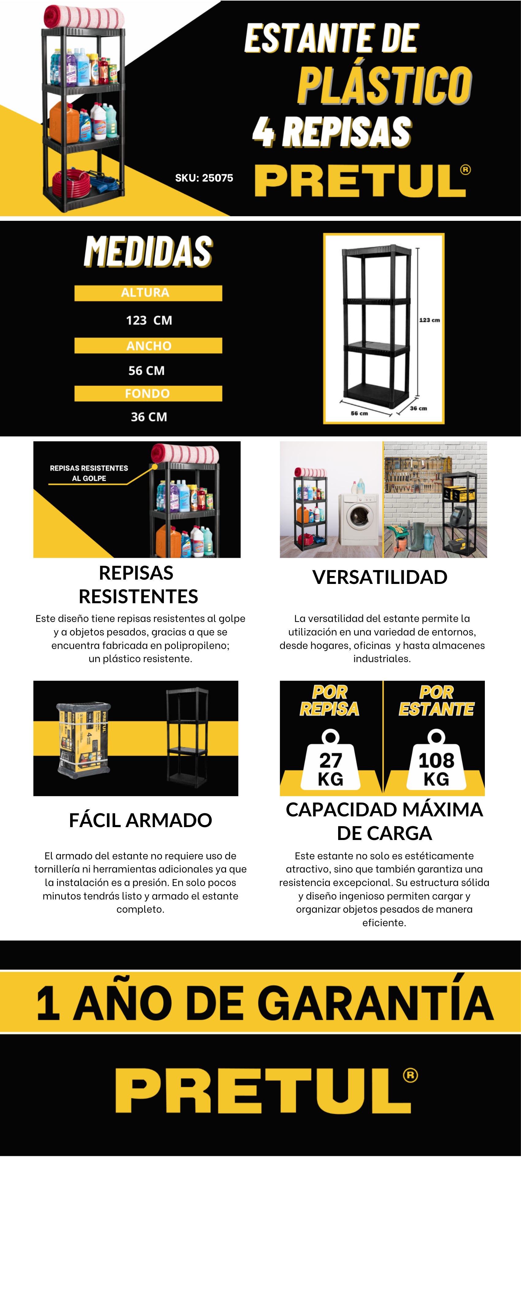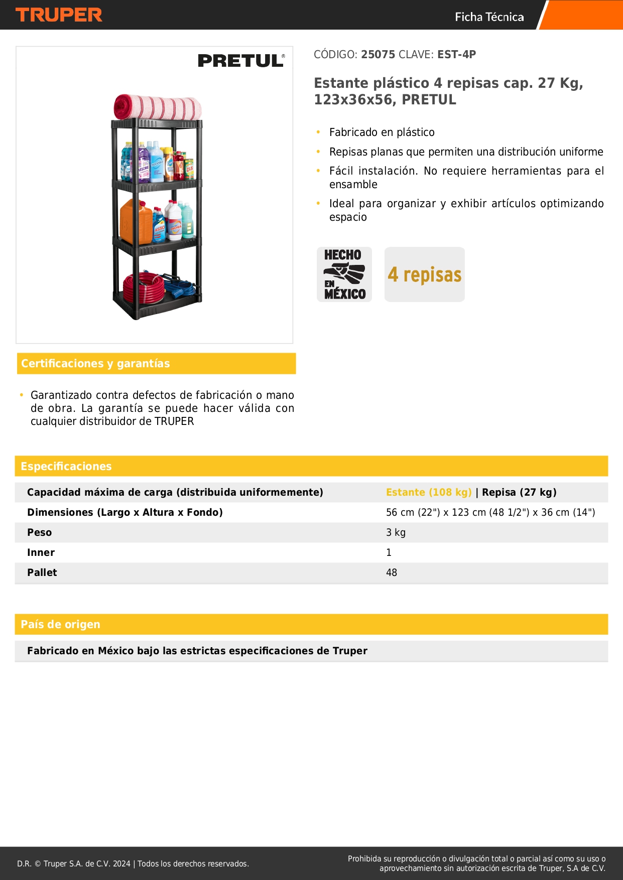 Estante plástico 4 repisas cap. 27 Kg, 123x36x56, PRETUL