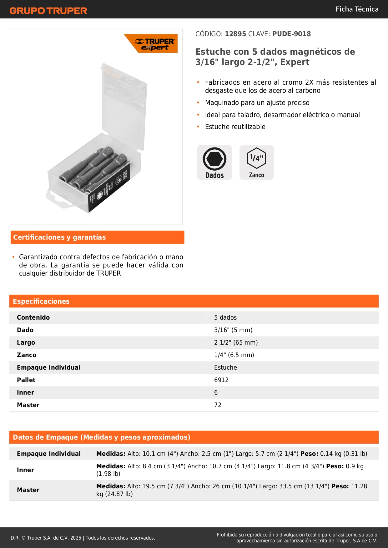 Estuche con 5 dados magnéticos de 3/16´´ largo 2´´, Expert Truper