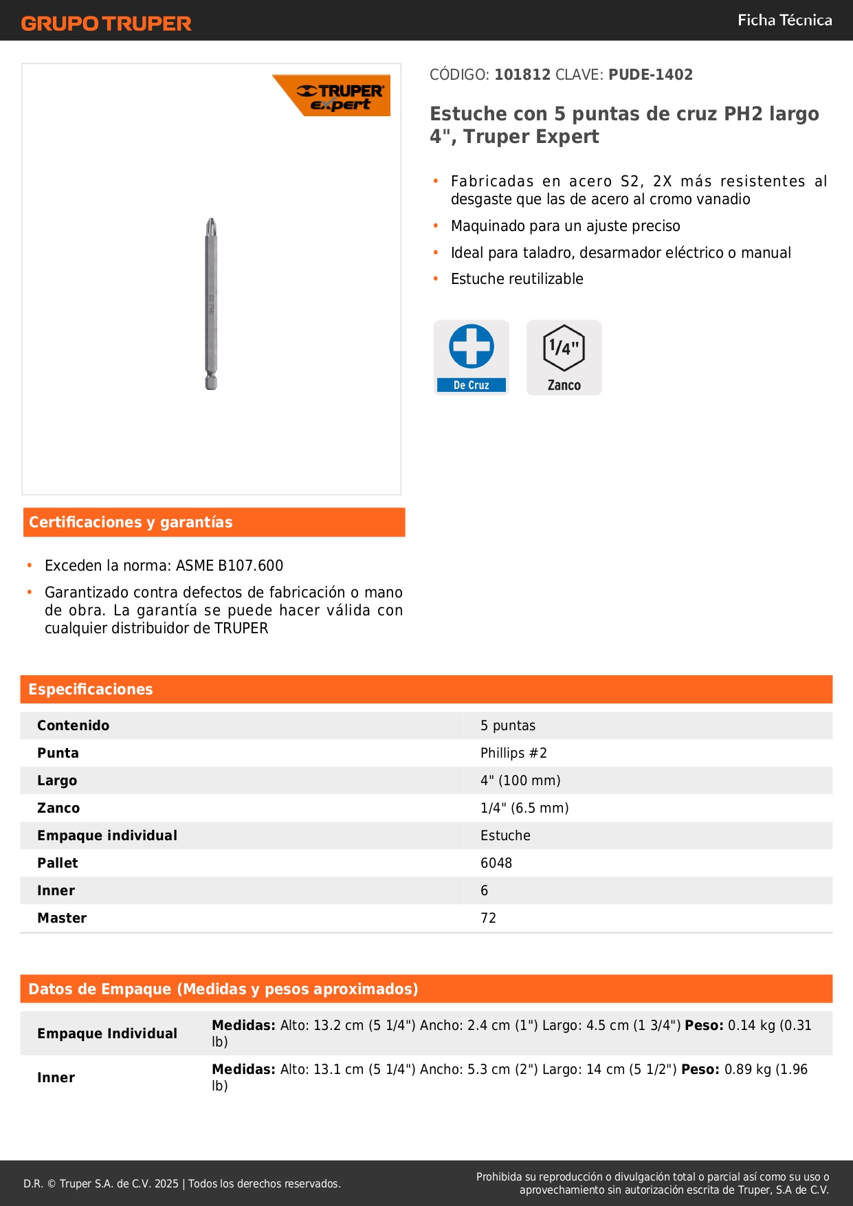Estuche con 5 puntas de cruz PH2 largo 4´´, Truper Expert
