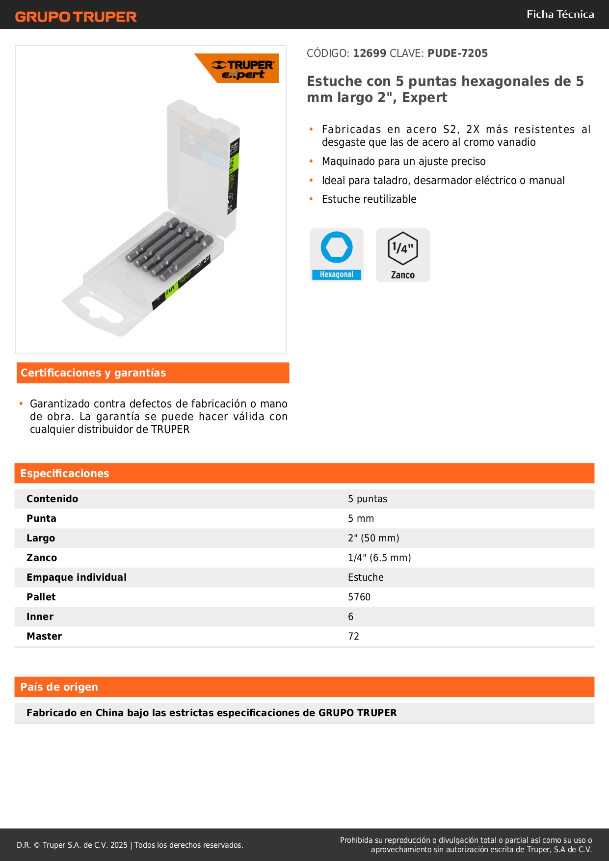 Estuche con 5 puntas hexagonales de 5 mm largo 2'', Expert Truper