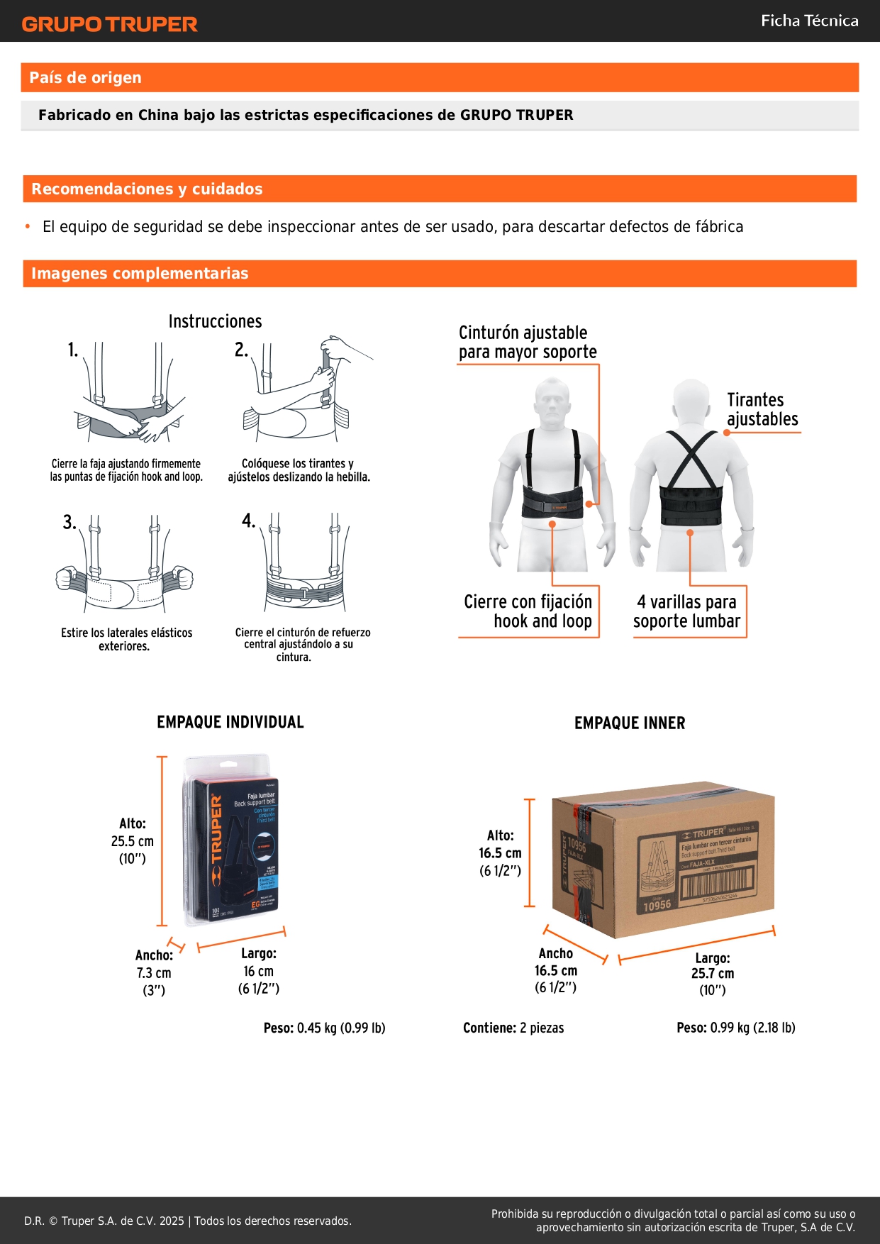 • Faja de fijación hook and loop con cinturón ajustable para mayor soporte