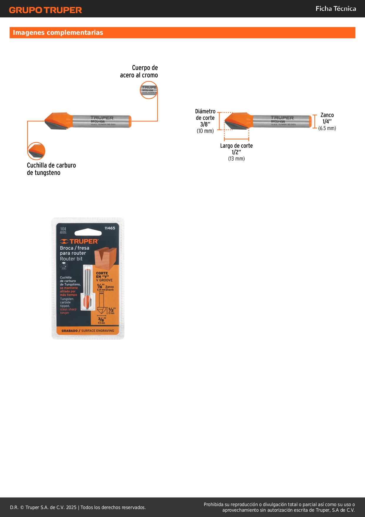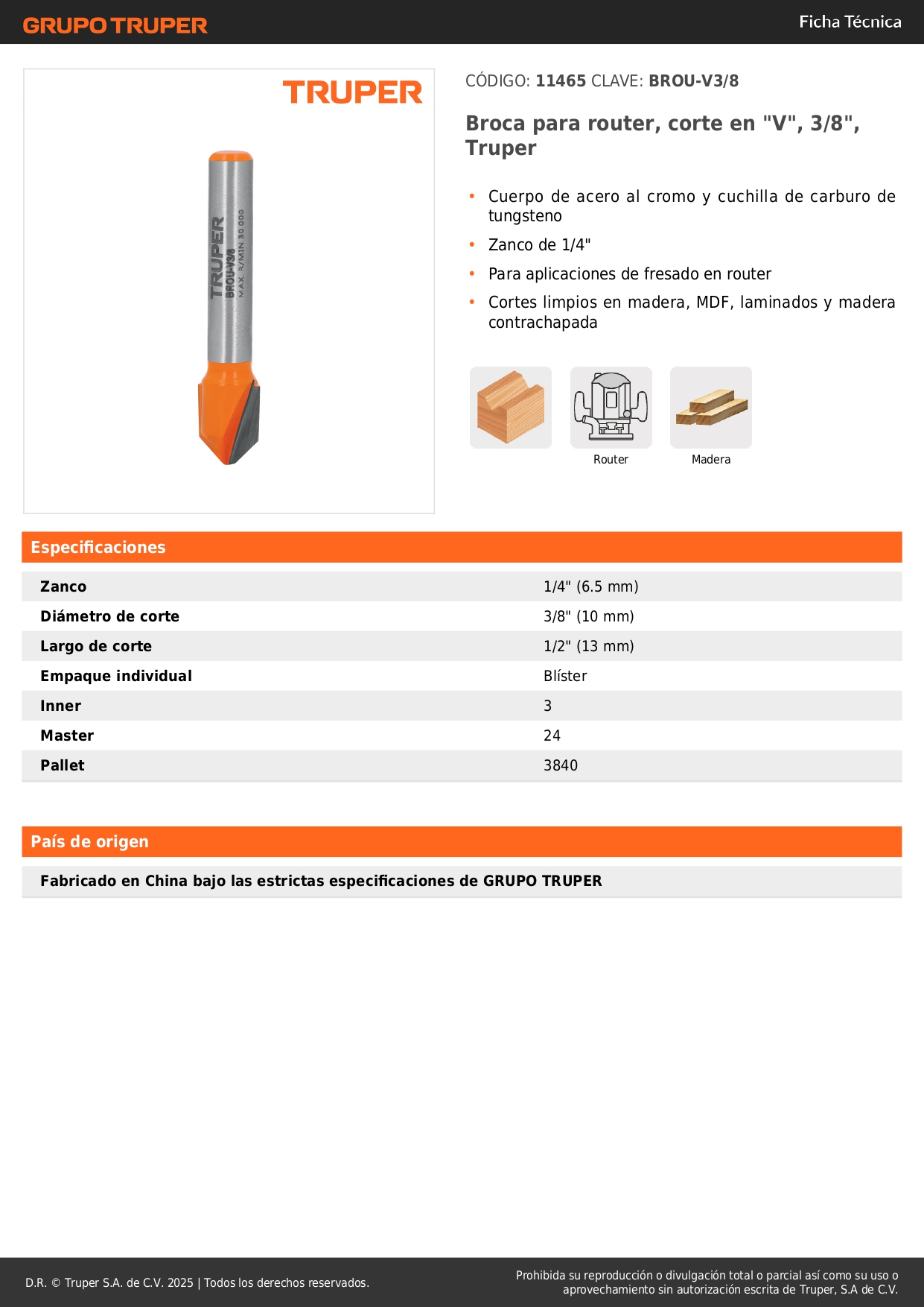Fresa corte en ´´V´´, 3/8´´, Truper