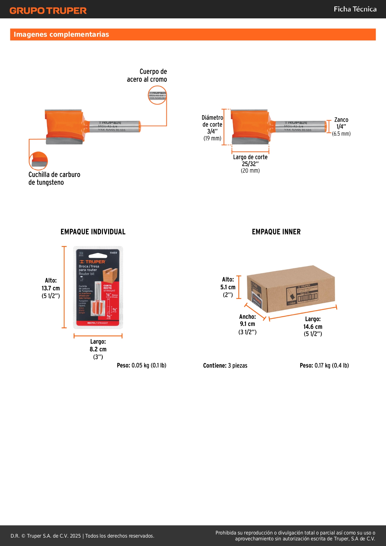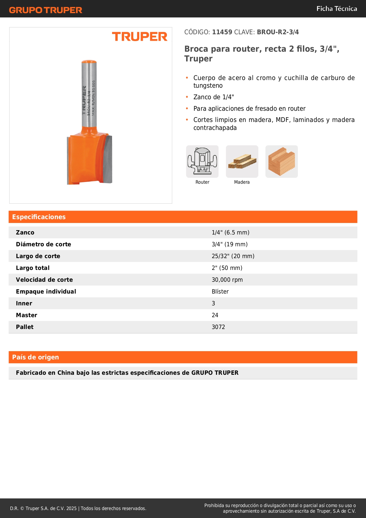 Fresa recta 2 filos, 3/4´´, Truper