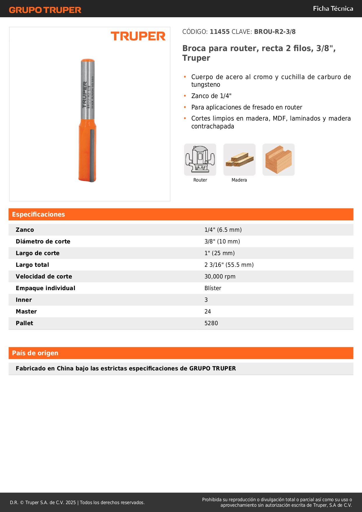Fresa recta 2 filos, 3/8´´, Truper