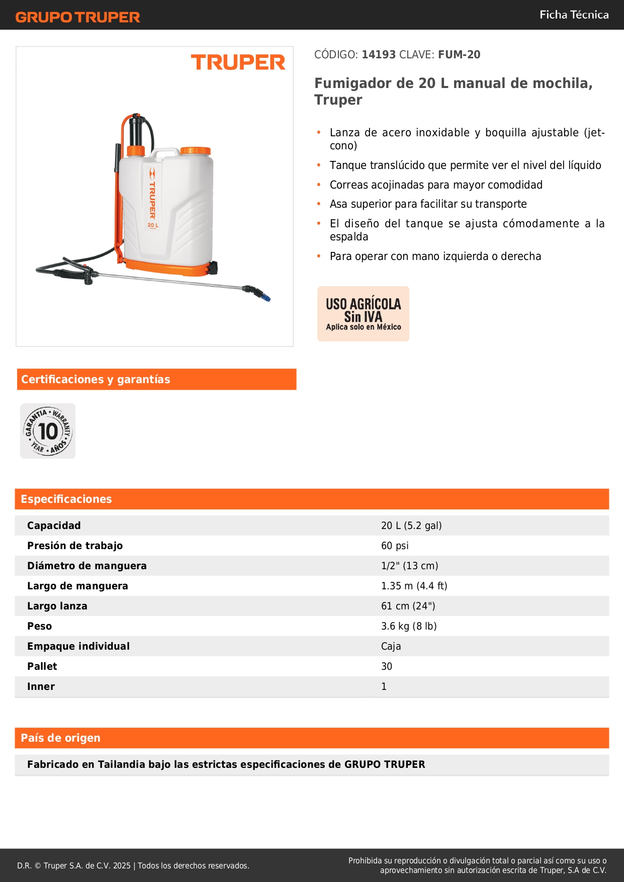 Fumigador de 20 L manual de mochila, Truper