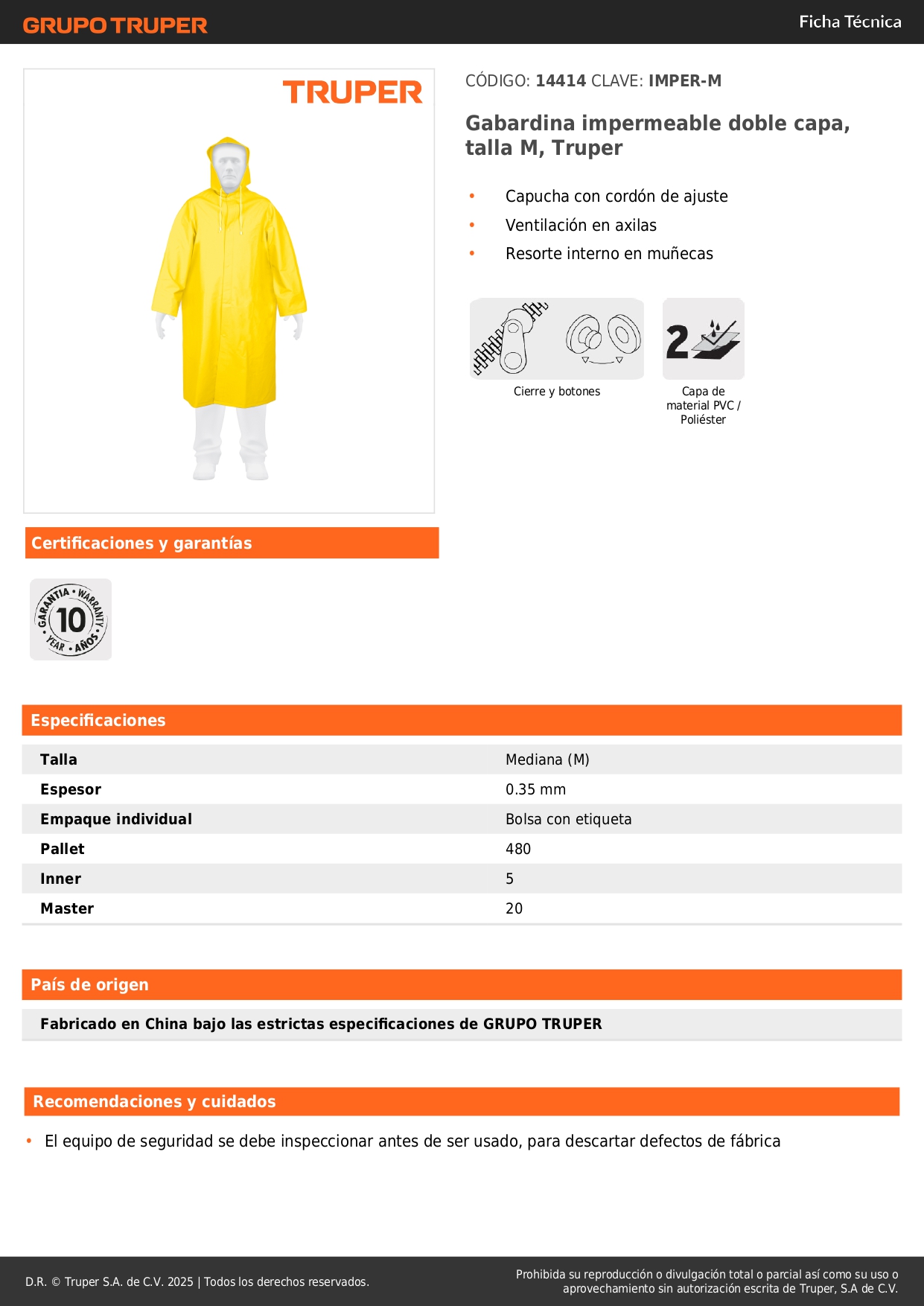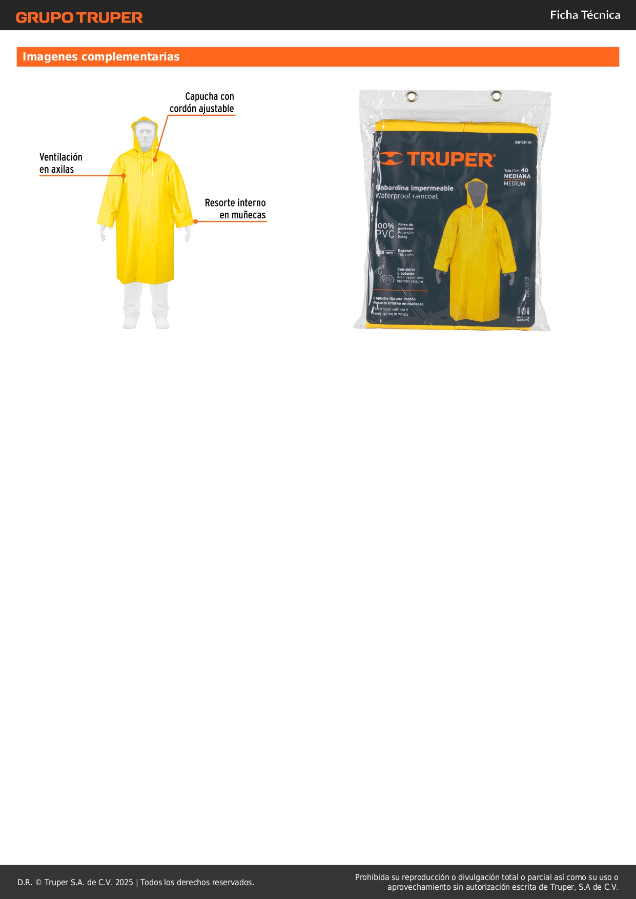 Gabardinas doble capa talla m Truper Stock por sucursal Stock por sucursal S/ 38.50 cantidad Agregar al carro Avísame cuando llegue -Capucha con cordón de ajuste-Ventilación en axilas-Resorte interno en muñecas