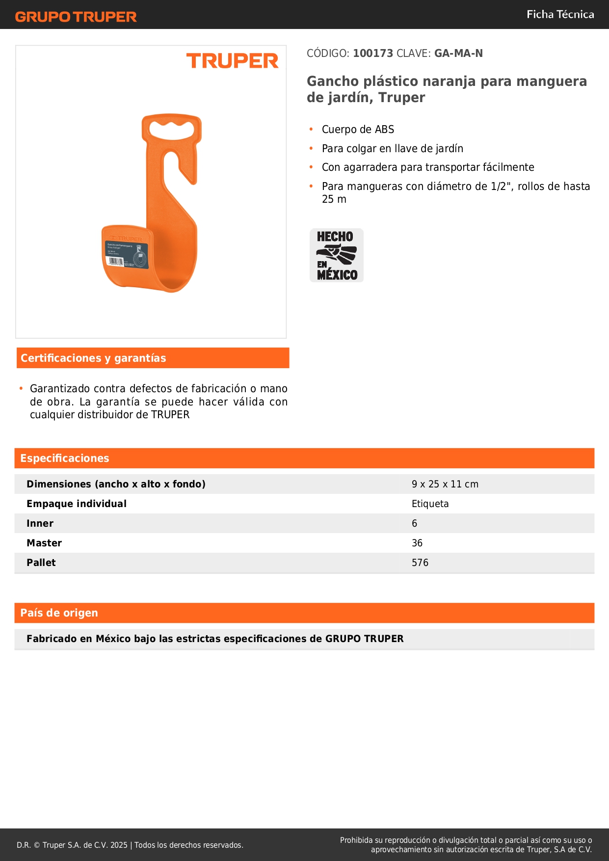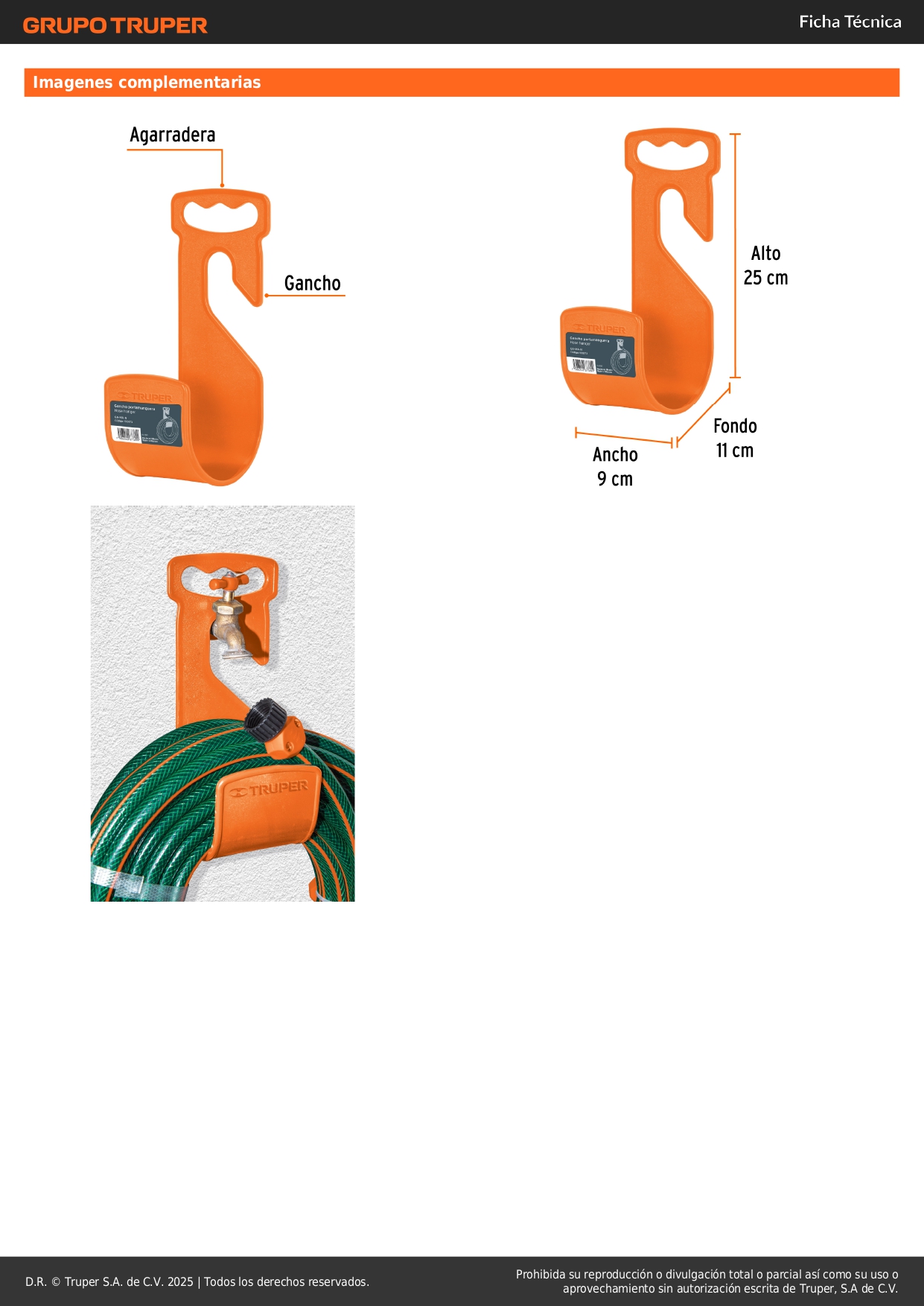 Gancho plástico naranja para manguera de jardín, Truper