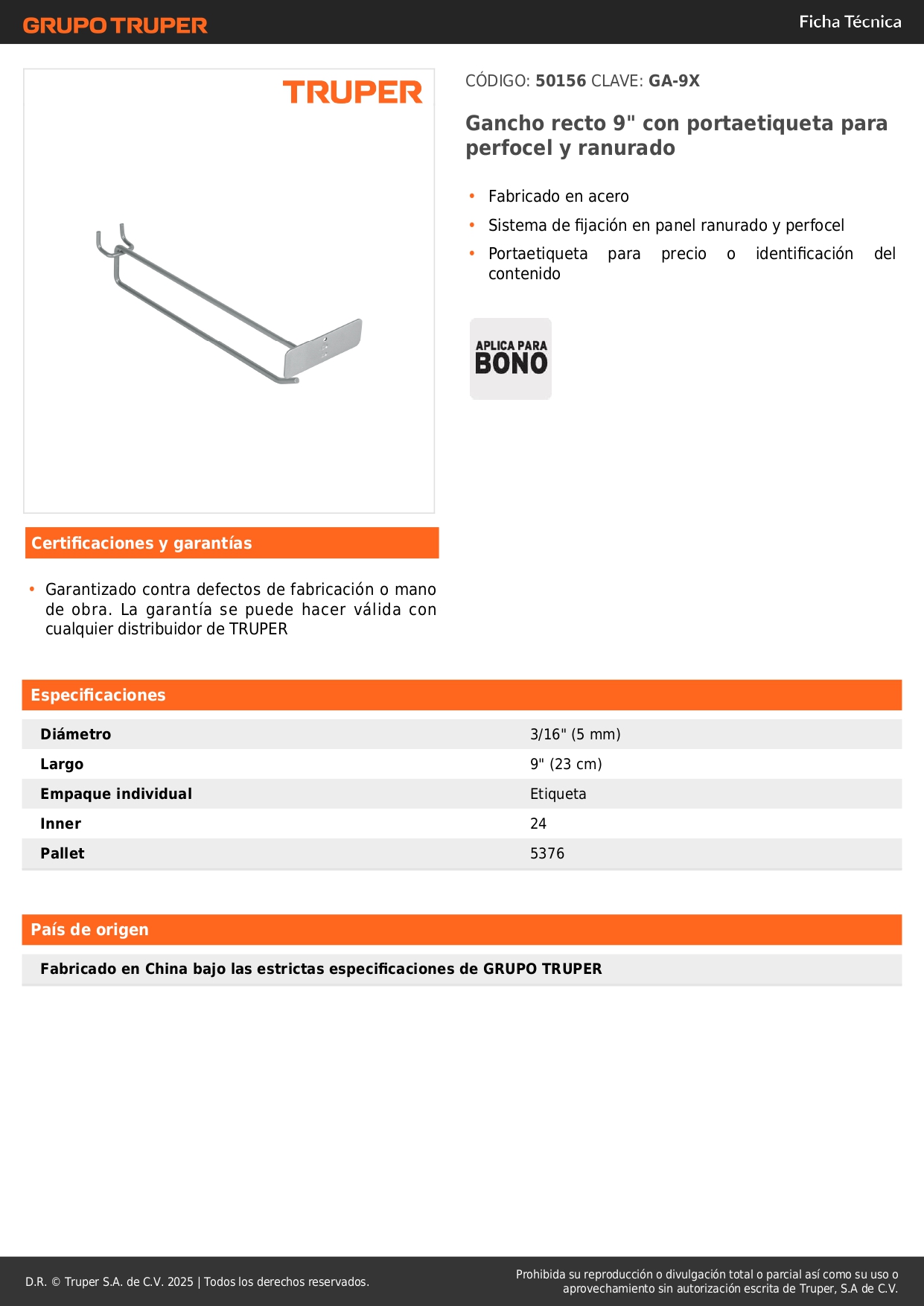 Gancho recto 9´´ con portaetiqueta para perfocel y ranurado Truper