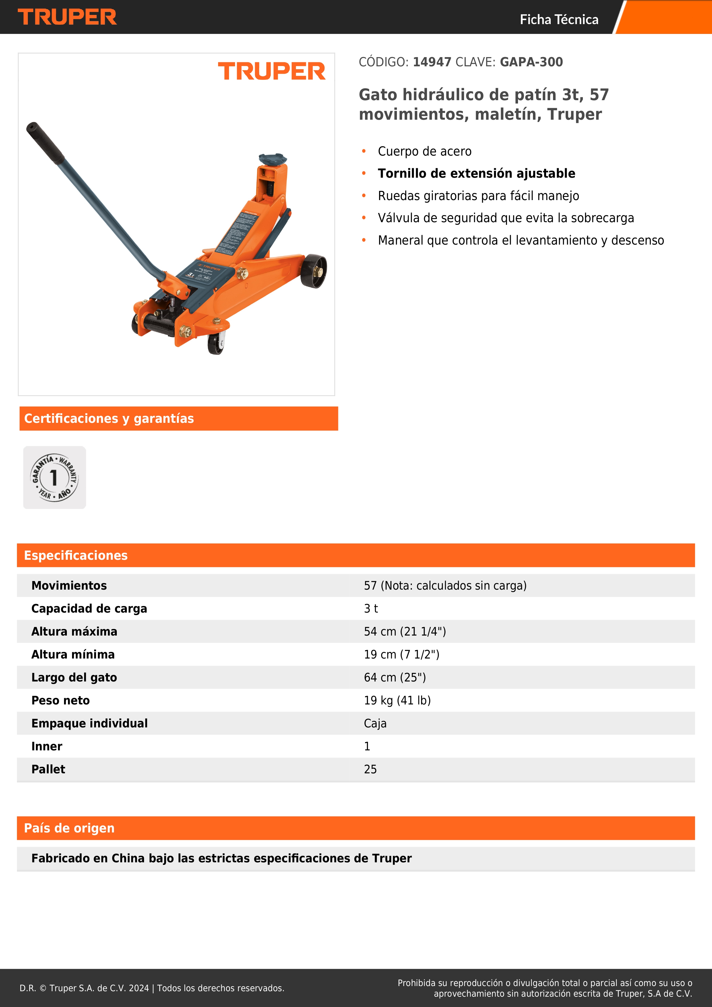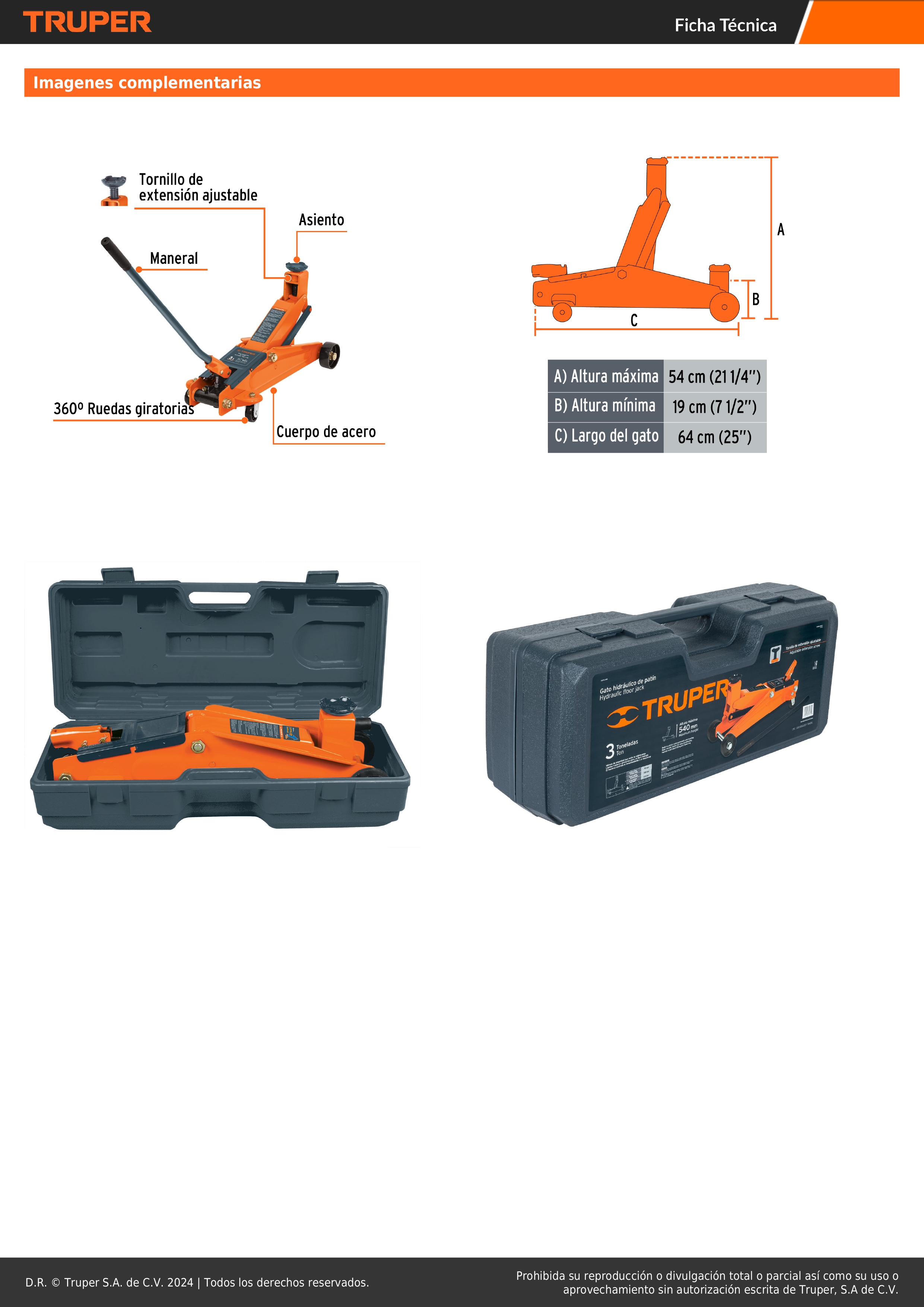 Gato hidráulico de patín 3t, 57 movimientos, maletín, Truper