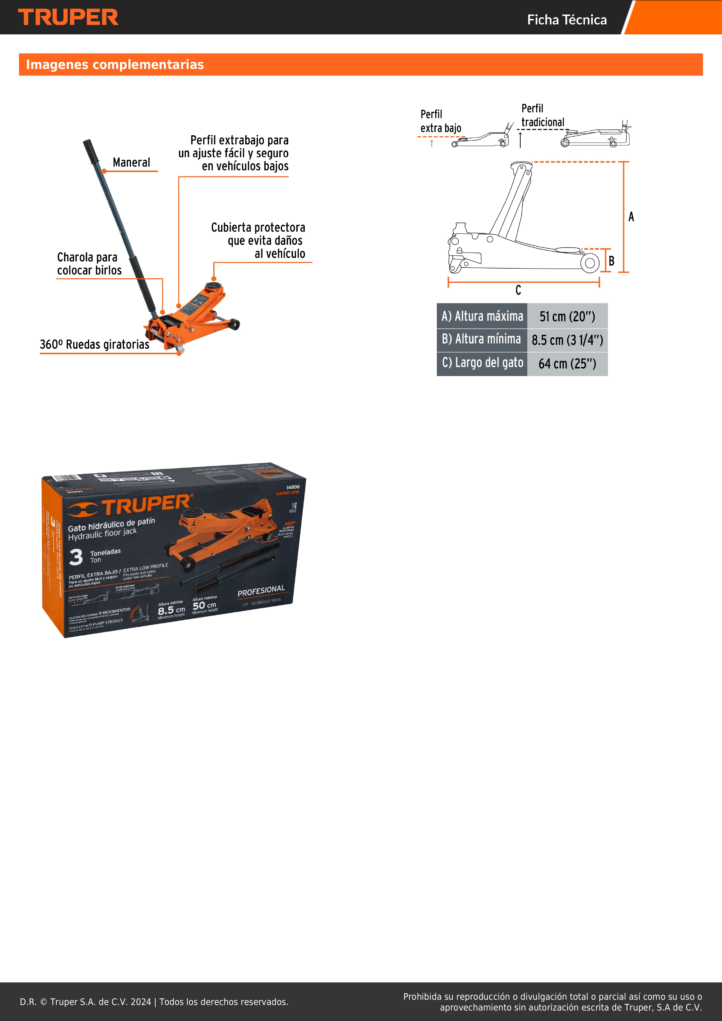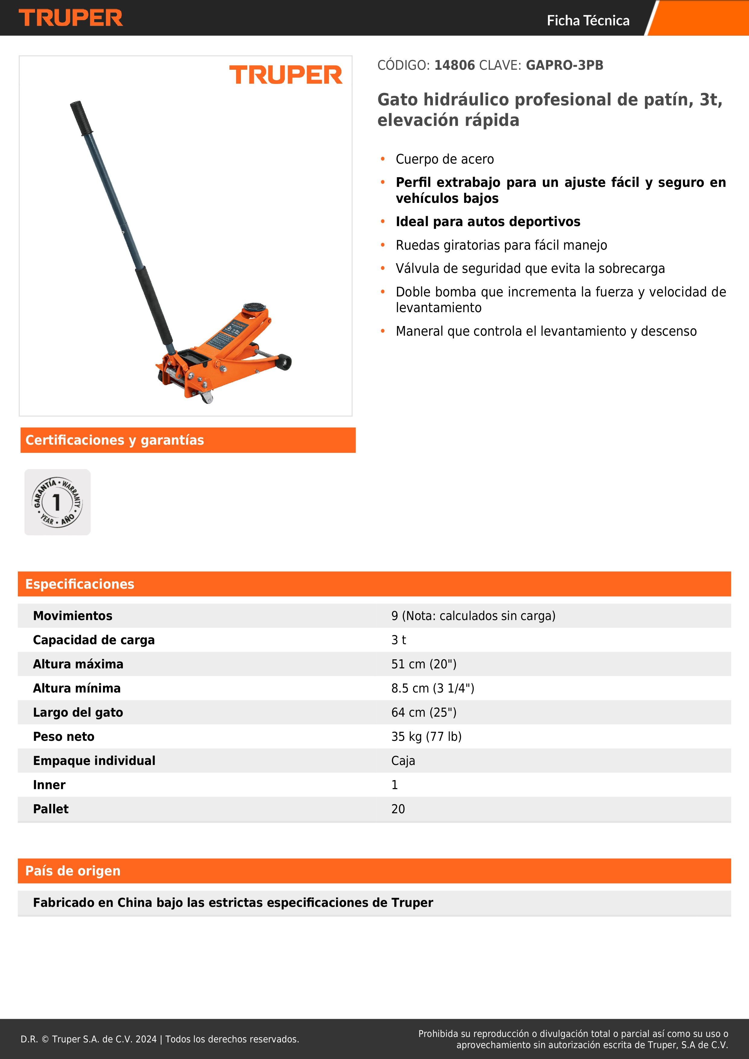 Gata tipo lagarto 3 toneladas elevación rápida perfil extra bajo TRUPER