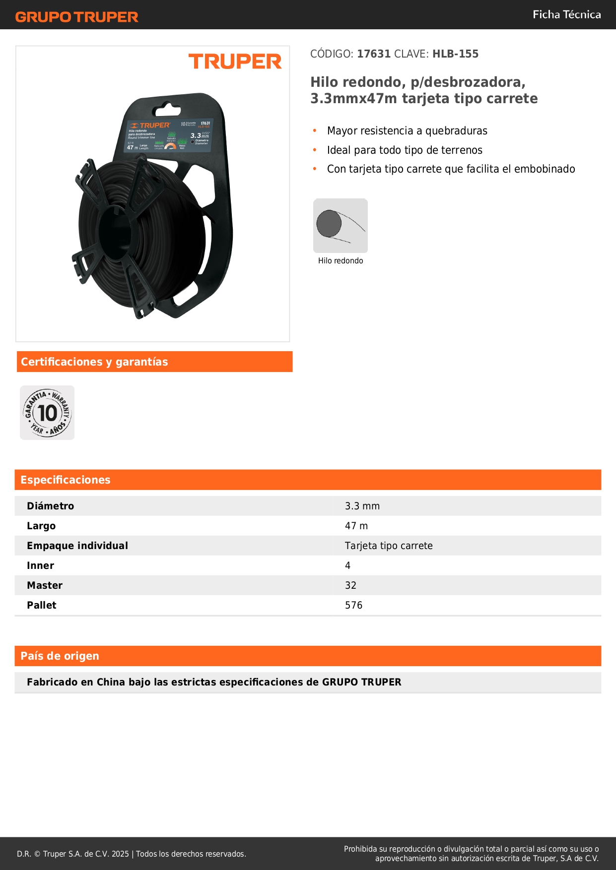 Hilo redondo, p/desbrozadora, 3.3mmx47m tarjeta tipo carrete