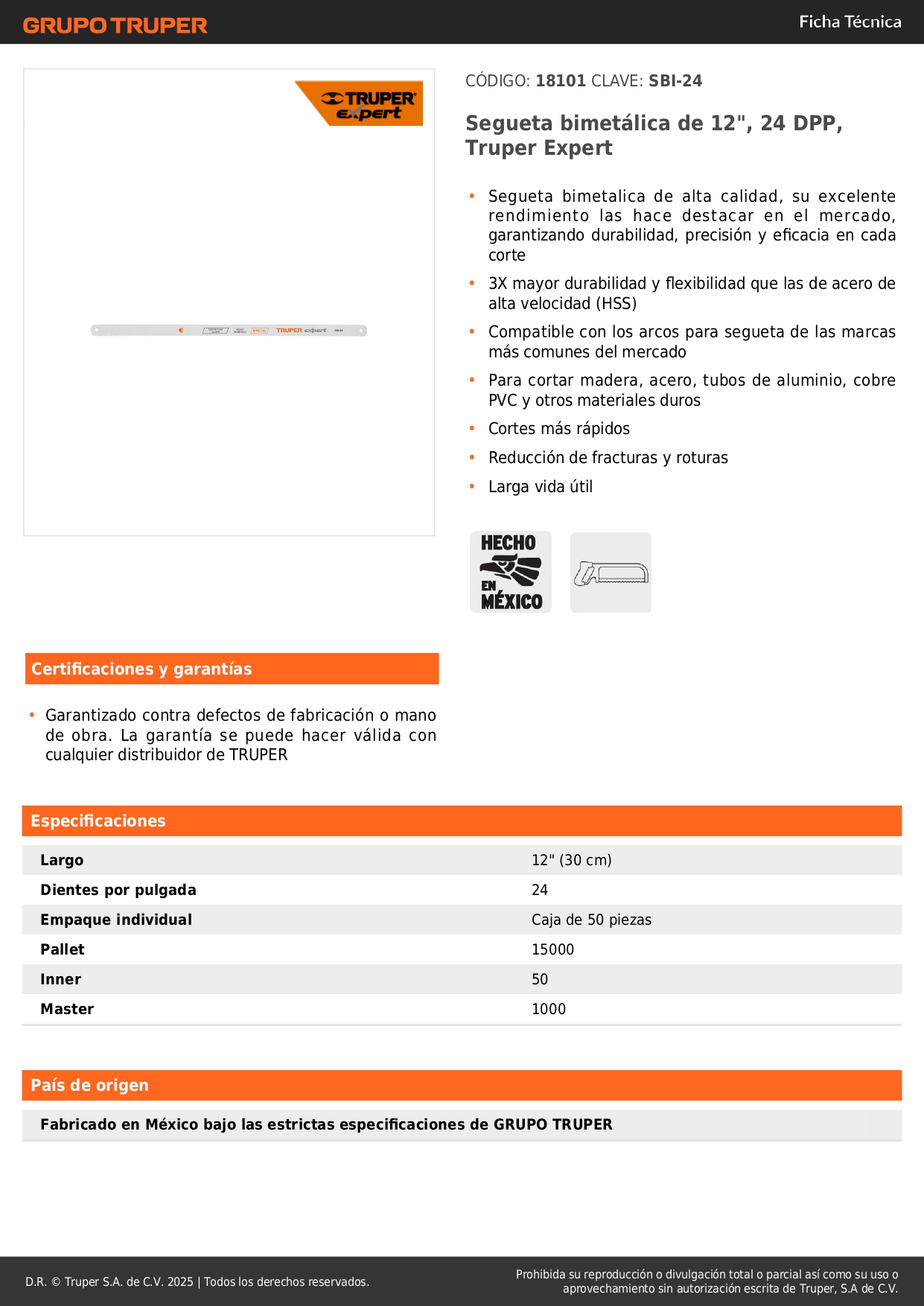 Hoja de sierra bimetálica de 12" 24 dpp Truper Expert