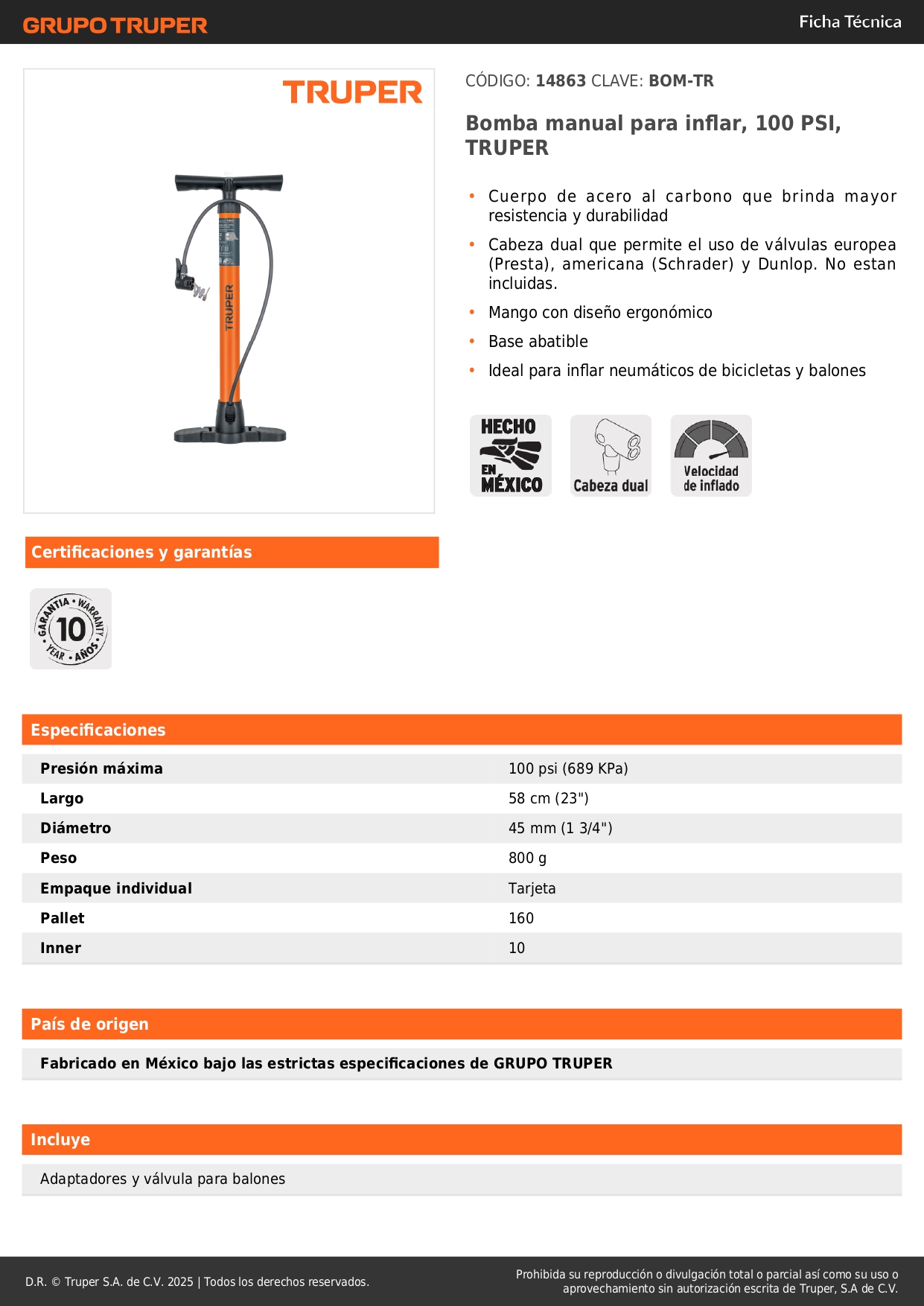 • Cabeza dual que permite el uso de válvulas europea (Presta), americana (Schrader) y Dunlop