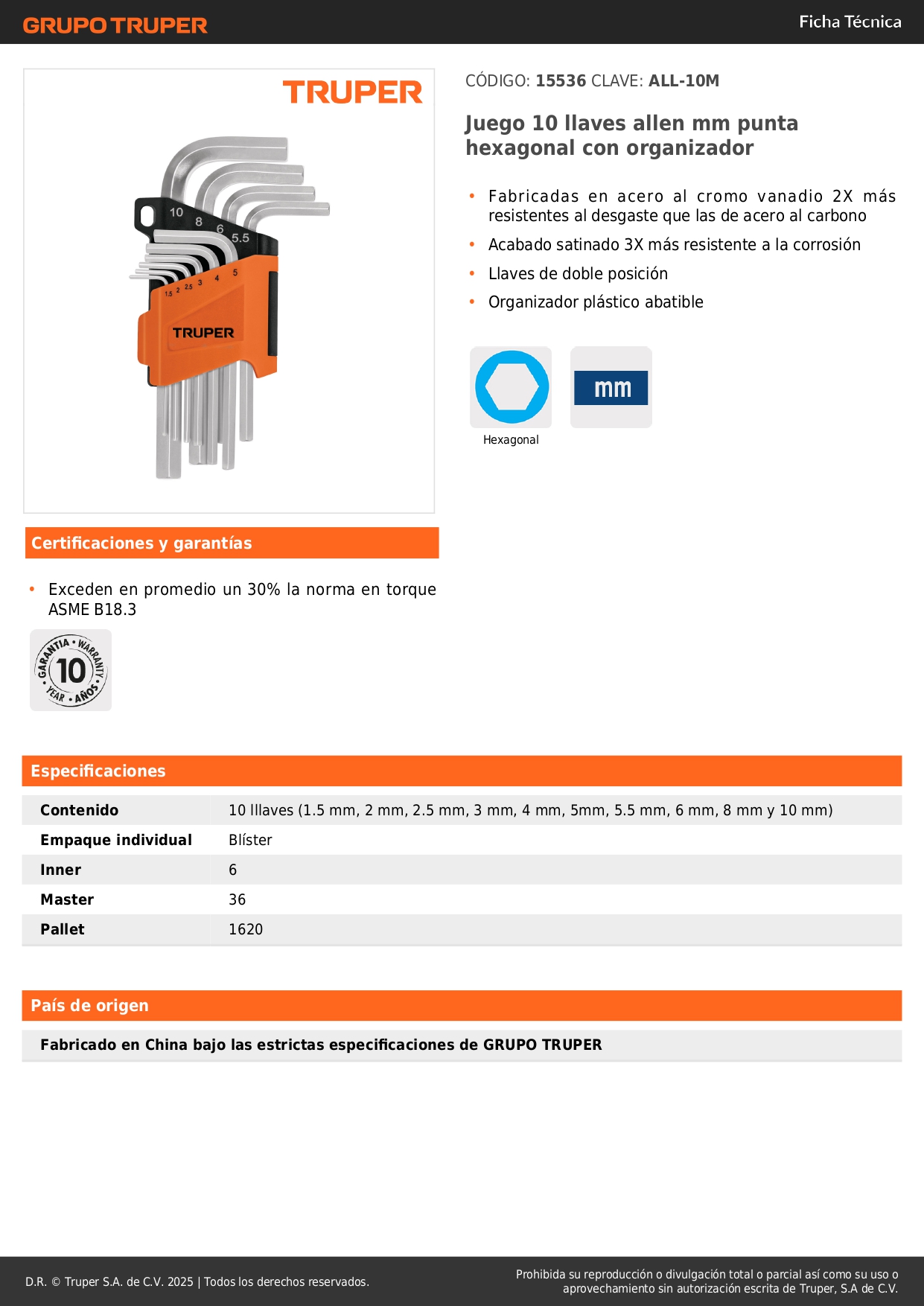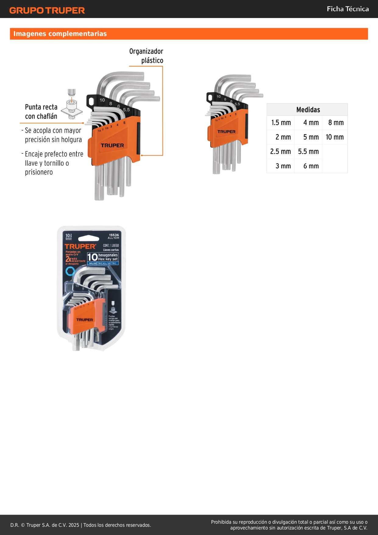Juego 10 llaves allen mm punta hexagonal con organizador Truper