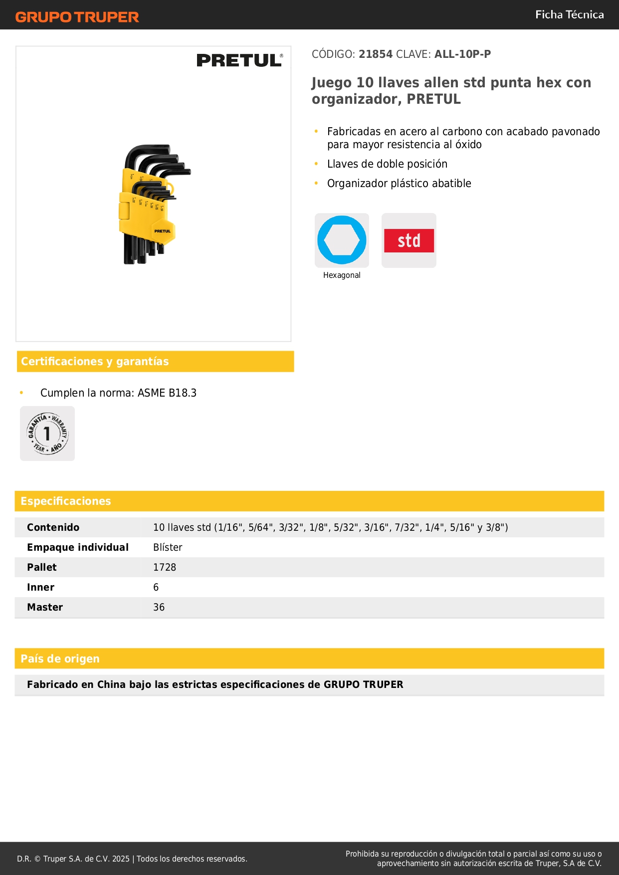 Juego 10 llaves allen std punta hex con organizador, Pretul