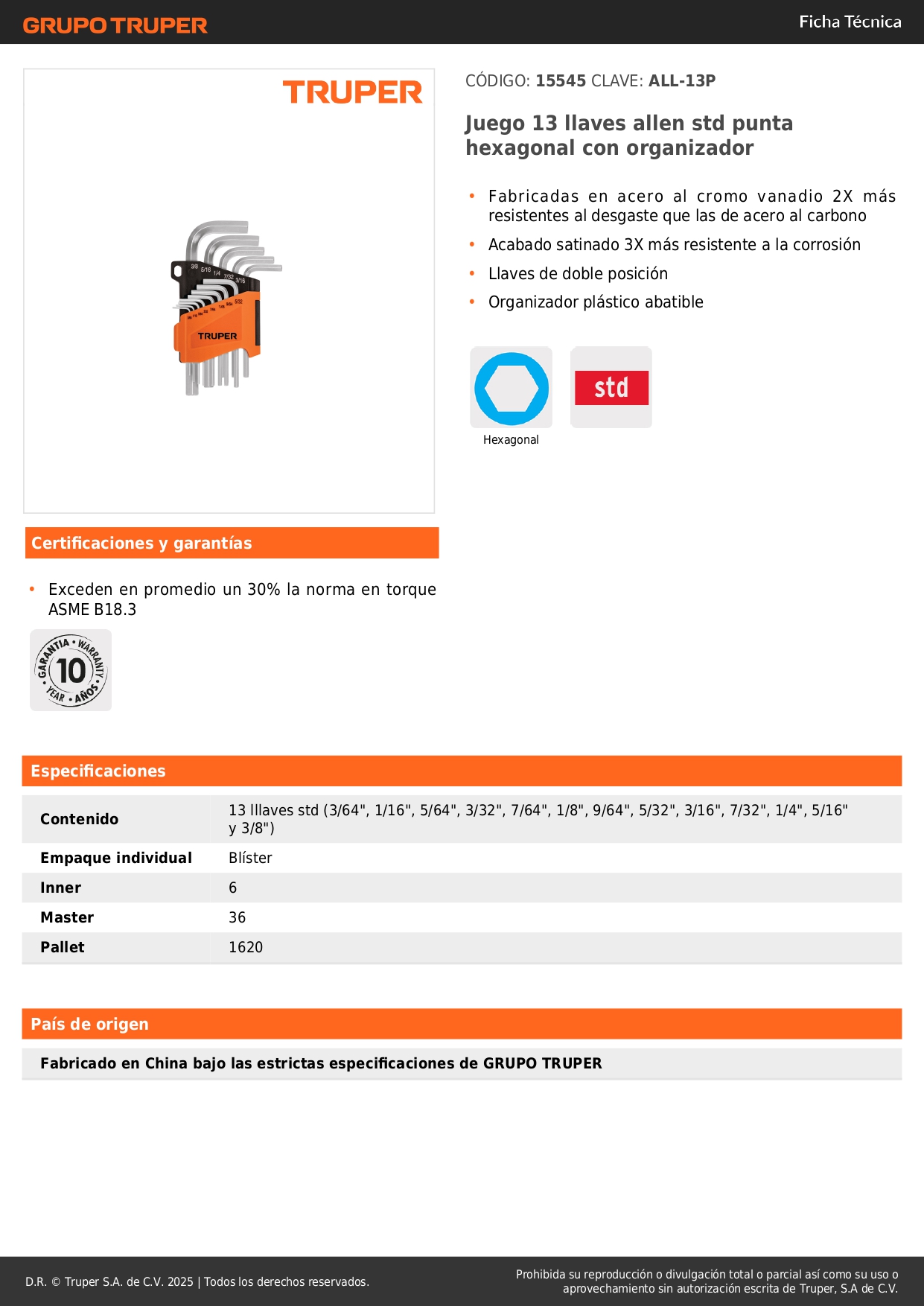 Juego 13 llaves allen std punta hexagonal con organizador Truper