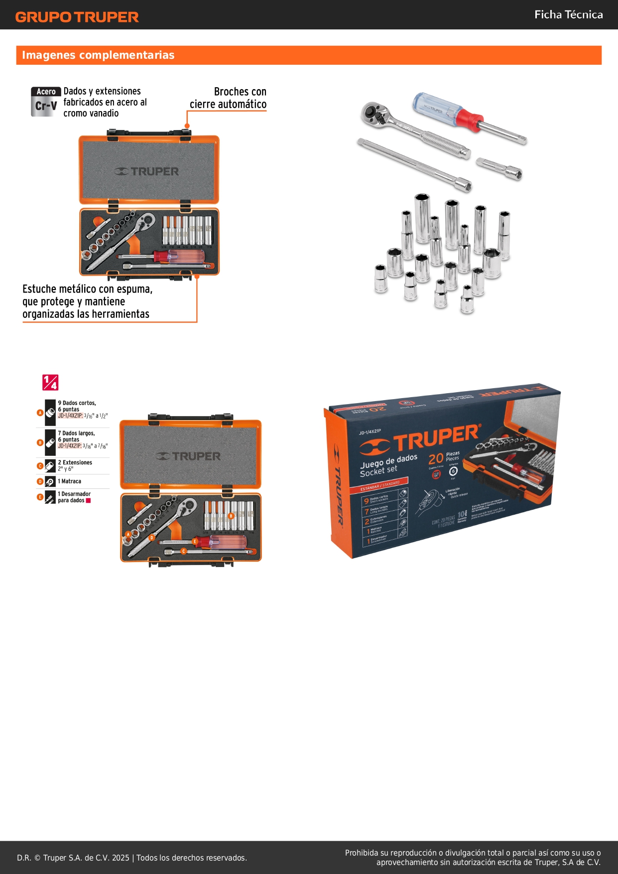 Juego de 20 herramientas cuadro 1/4'' std para mecánico Truper