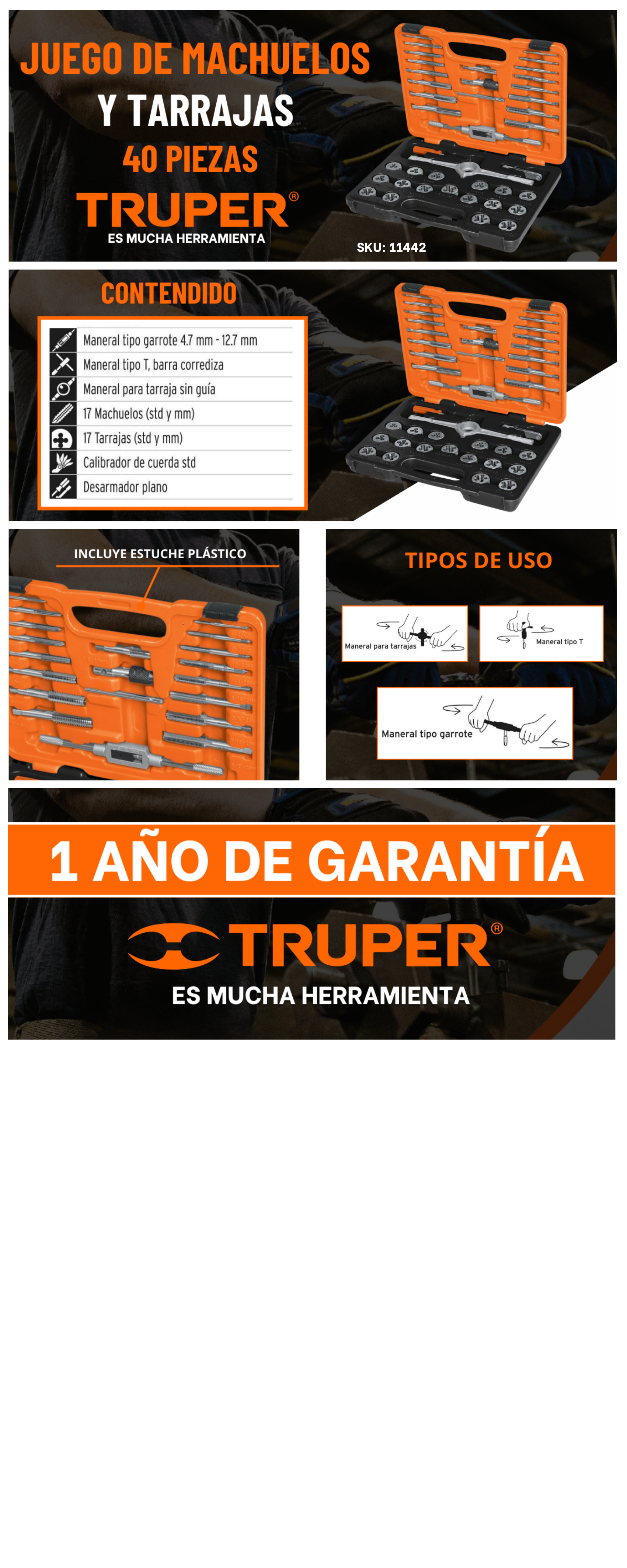 17 Tarrajas (std y mm). Medidas: 1/8x27NPT, 1/4X20NC, 1/4X28NF, 5/16X18NC, 5/16X24NF, 3/8X16NC, 3/8X24NF, 7/16X14NC, 7/16X20NF, 1/2X13NC, 1/2X20NF, 4-40NC, 6-32NC, 8-32NC, 10-24NC, 10-32NCF, 12-24NC