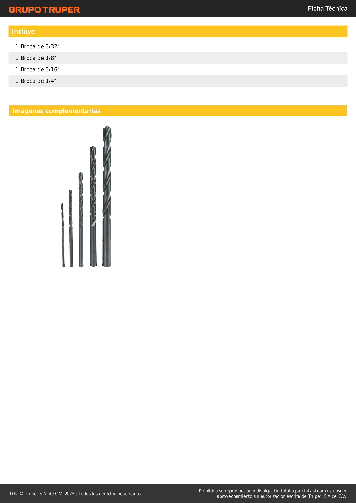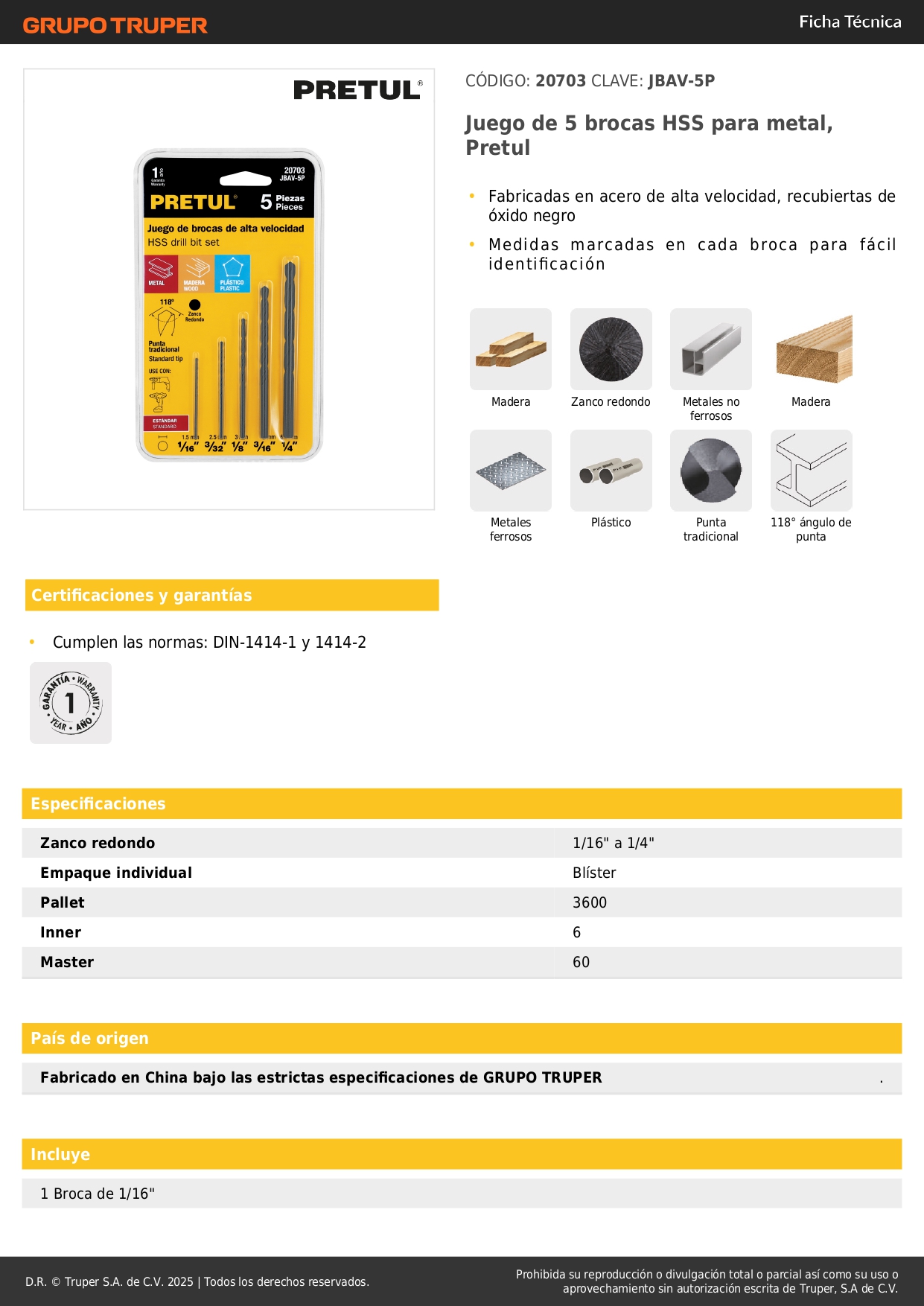 Juego de 5 brocas HSS para metal Pretul Stock por sucursal Stock por sucursal S/ 15.90 cantidad Agregar al carro Avísame cuando llegue Recubiertas de óxido negro.Medidas marcadas en cada broca para fácil identificación.